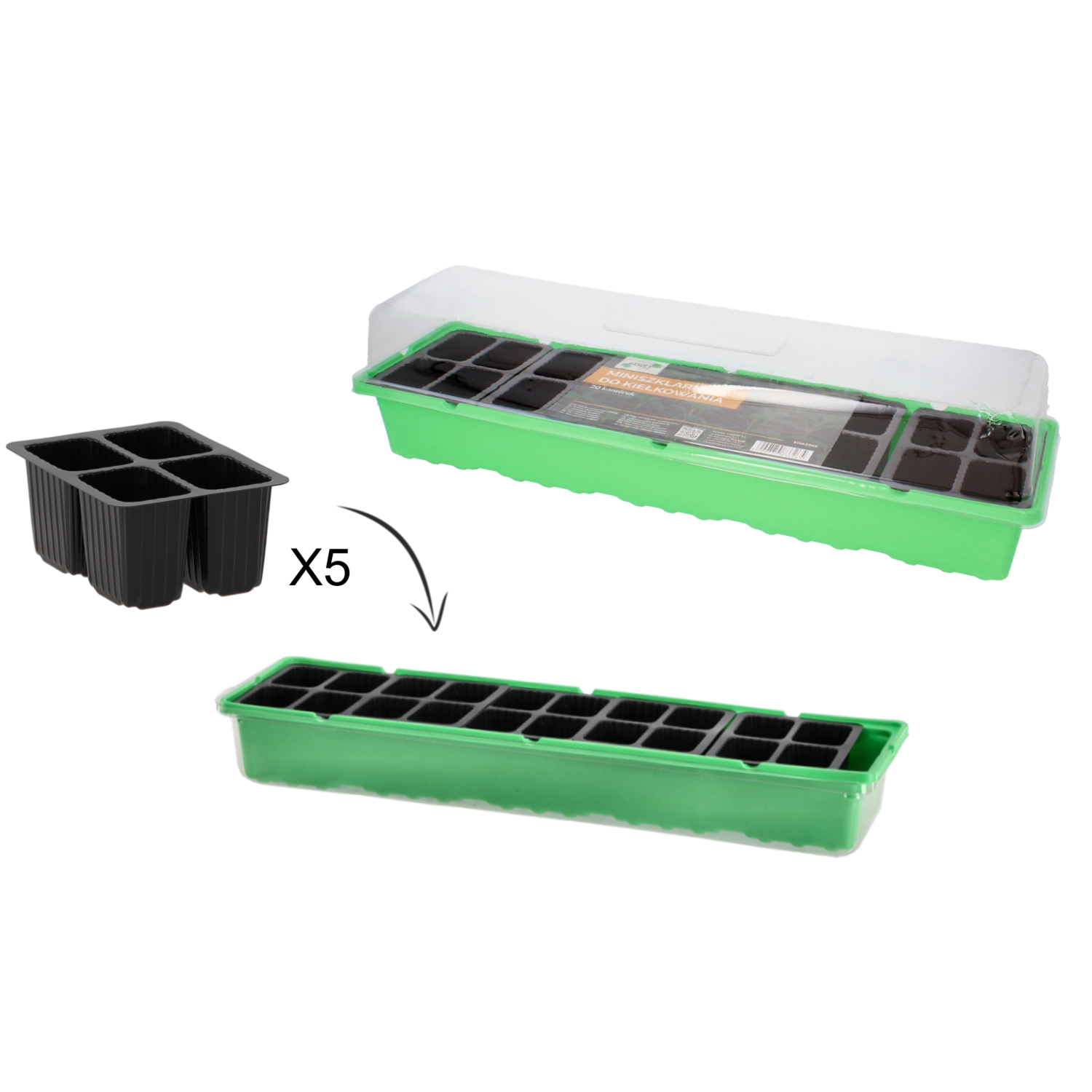 De modulære celler gør det nemt at håndtere kimplanterne uden at beskadige rødderne. Drænåbninger i hver celle sikrer korrekt afledning af overskydende vand, så frøene ikke rådner, og planterne etablerer sig bedre. Drivhuset er let, holdbart og perfekt til vindueskarmen, drivhuset eller til hjemmeavl af krydderurter og grøntsager.