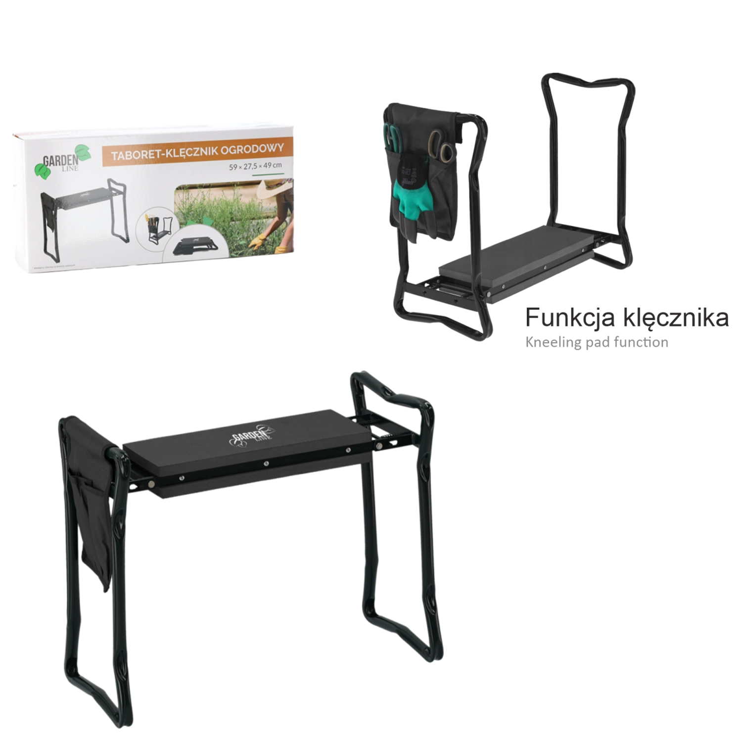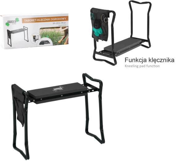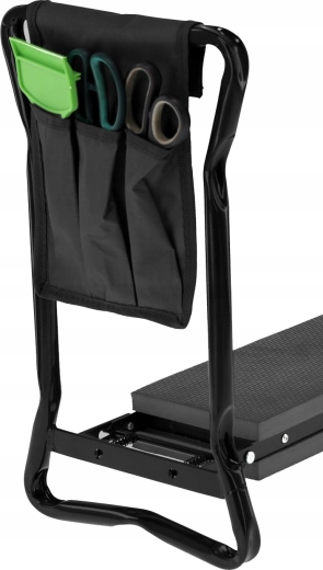 Den sidemonterede tekstillomme holder dine sakse, små river eller handsker lige ved hånden. Takket være de sammenklappelige ben kan produktet nemt opbevares i garage eller bil og tages med i haven, på picnic eller på fisketuren. Materialer af høj kvalitet (jern, EVA-skum, Oxford-stof) sikrer lang levetid og holdbarhed ved daglig brug.