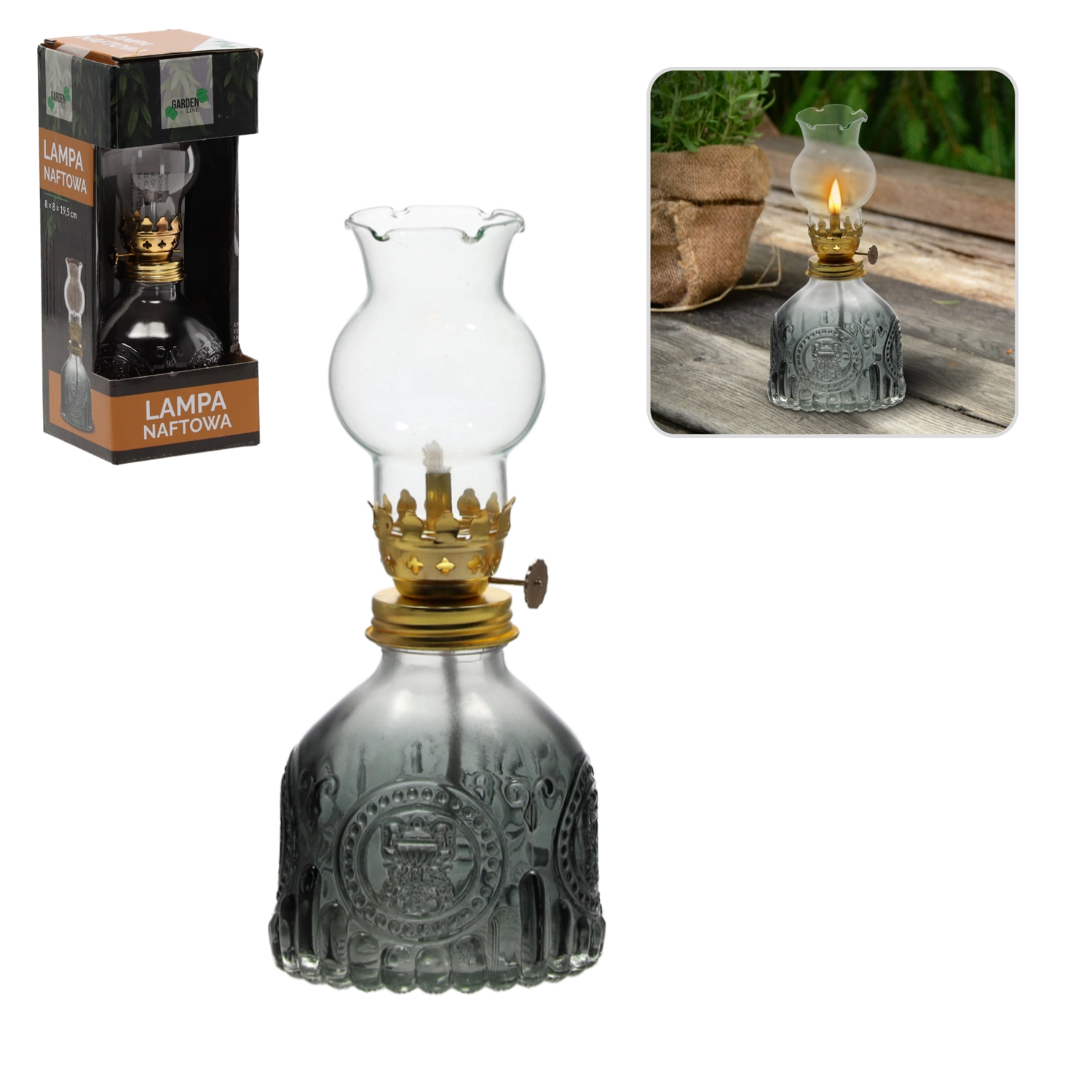 Oplev magien ved traditionel belysning. Glas-petroleumslygten kombinerer et elegant udseende med funktionel anvendelse. Den er perfekt som dekorativt element i stuen, soveværelset eller i haven, hvor den skaber en hyggelig atmosfære med et blødt, varmt lys.