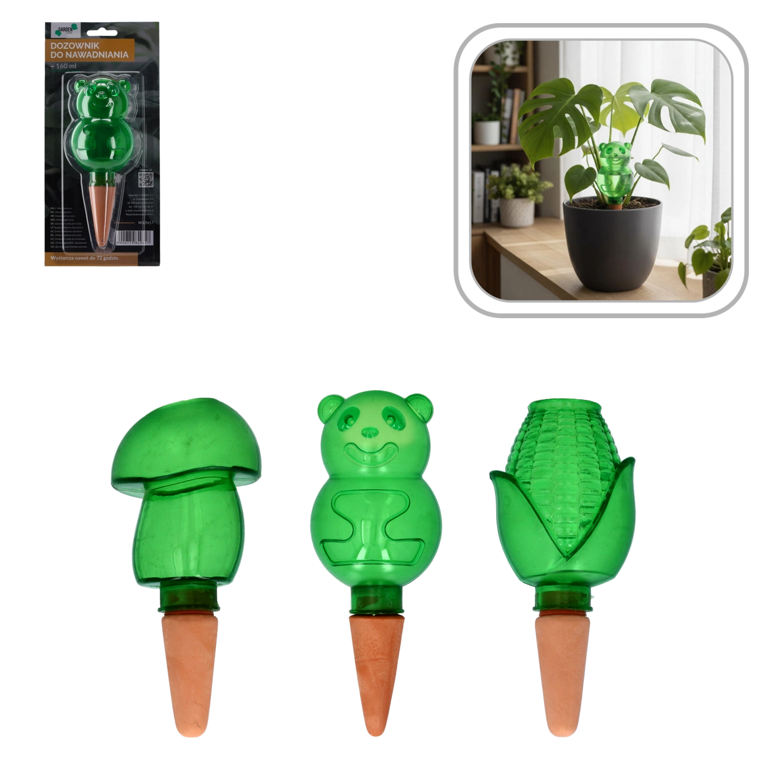 Takket være de dekorative former – bamse (ca. 160 ml), majskolbe (ca. 124 ml) og svamp (ca. 106 ml) – bliver dispenseren ikke kun en funktionel hjælper, men også et stilfuldt tilbehør i enhver potte. Ideel til ferier, weekender væk eller til travle planteejere.