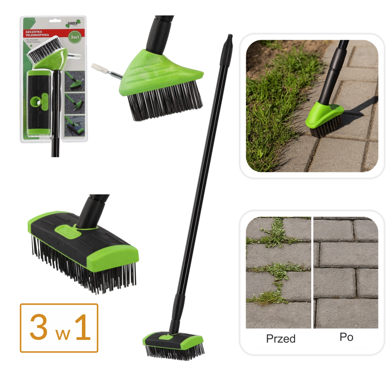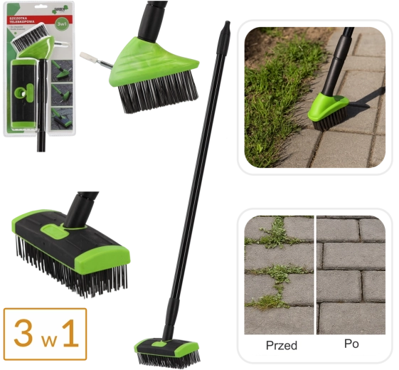 Det praktiske 3-i-1 sæt kombinerer tre kraftige hoveder til grundig rengøring af udendørs overflader. De stive stålbørstehår med messingbelægning klarer snavs, mos og ukrudt uden kemi, mens den lette og robuste teleskopstang gør det behageligt at arbejde stående. Ideelt til belægningssten, kantsten, gårdspladser og terrasser.