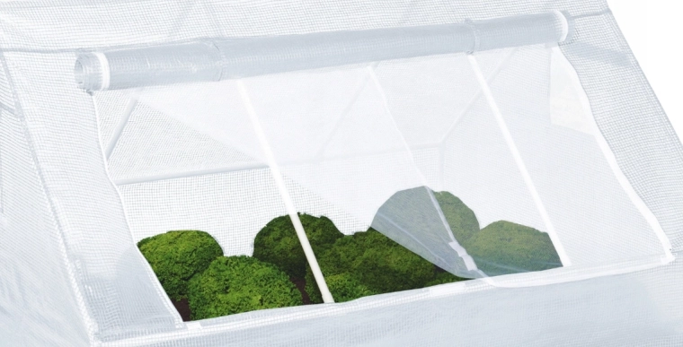 Rullevinduer med myggenet og frontgardin med lynlås sikrer optimal luftcirkulation og bekvem pleje af planterne.