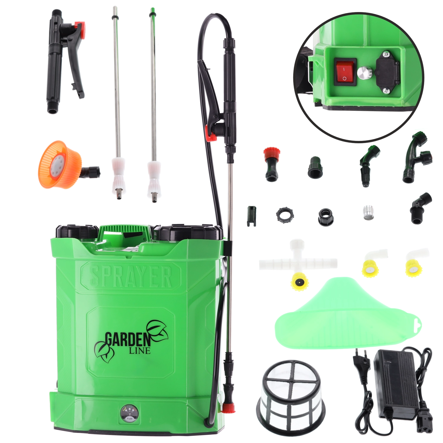 I pakken finder du flere typer dyser, herunder tåge- og sektordyser, som sikrer fin dækning af blade og målrettet sprøjtning i højden ved hjælp af den metal teleskoplanse. Betjeningspanelet med ON/OFF-afbryder, drejelig regulator og batteristatusindikator gør præcis dosering let. Medfølger gør også et filtersi mod urenheder, som beskytter pumpe og dyser.