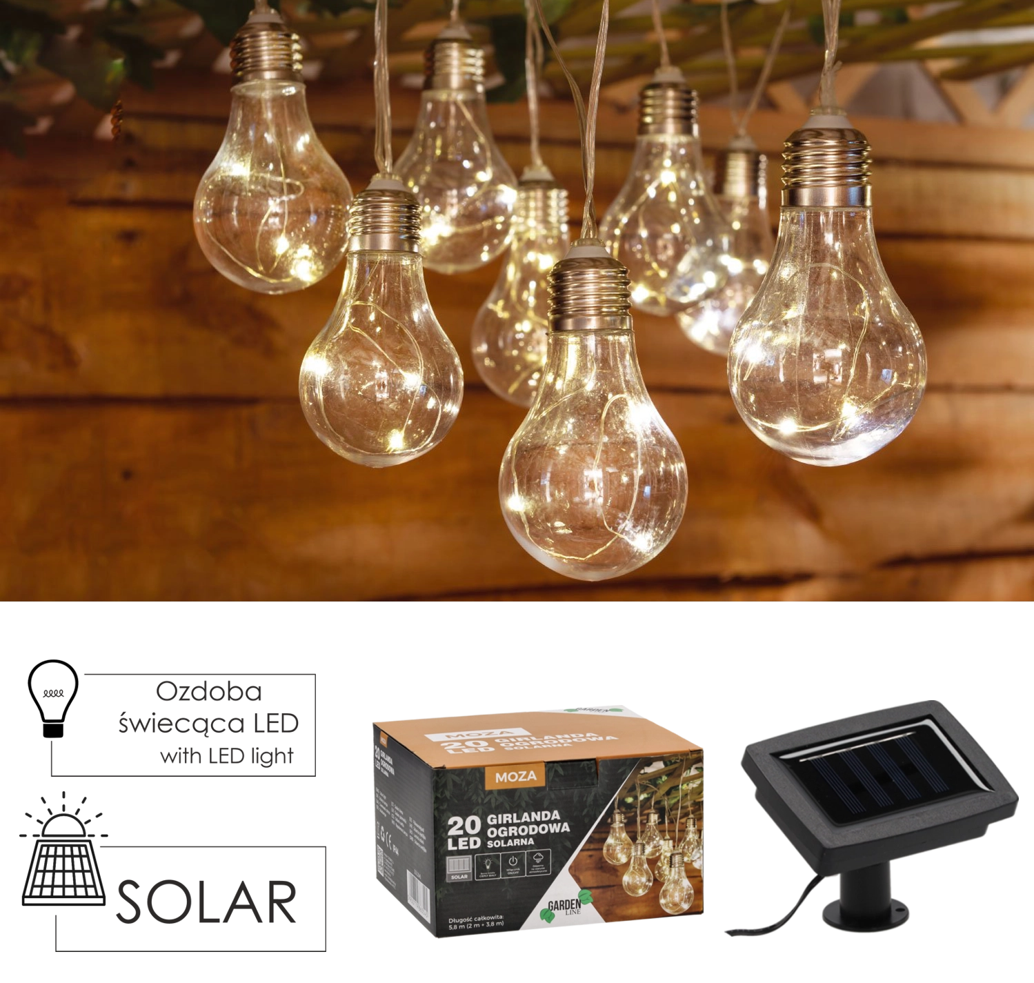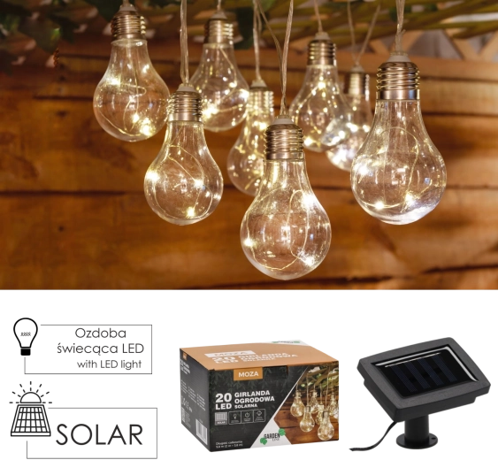 Stilfuld solcelledrevet guirlande med 20 LED i varm hvid, der oplyser altan, terrasse og have. Takket være solcelle-drift kan du placere den hvor som helst uden stikkontakt og samtidig spare energi. Beskyttelse IP44 klarer udendørsforhold, og tilstandene konstant lys og blink skaber en hyggelig atmosfære på sommeraftener.