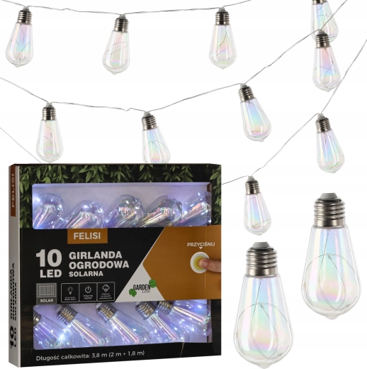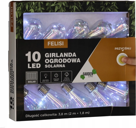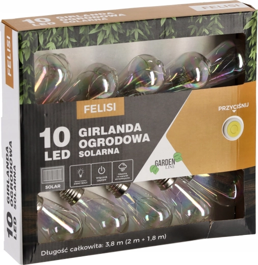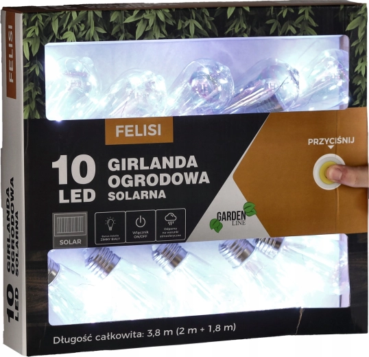 Den solcelledrevne lysskæde FELISI er en stilfuld og økonomisk udendørs belysning, der oplyser siddeområder, pergolaer og træer. Det integrerede solpanel oplader batteriet i løbet af dagen og tænder automatisk 10 LED-pærer med klart, koldt hvidt lys for en behagelig aftenstemning.