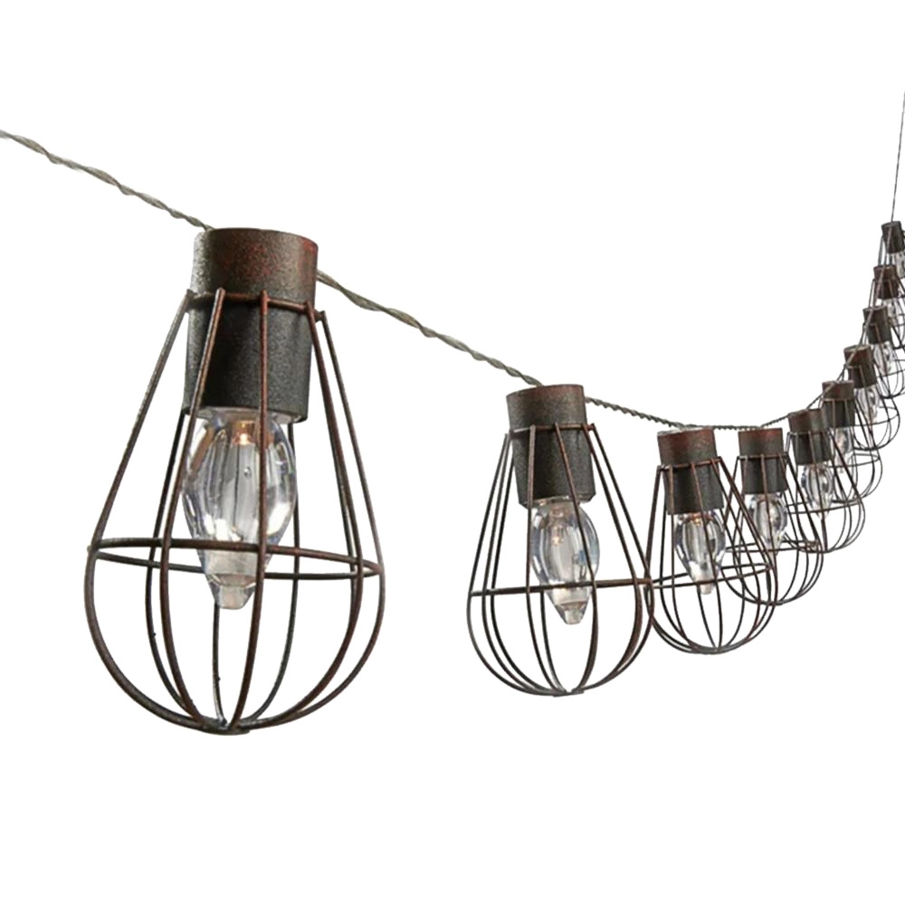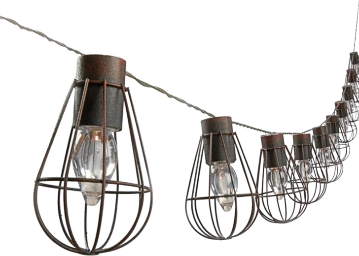 Trådformede metalbure beskytter pærerne og giver et industrielt udtryk, der passer perfekt til naturtræ og mursten.