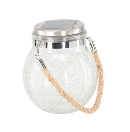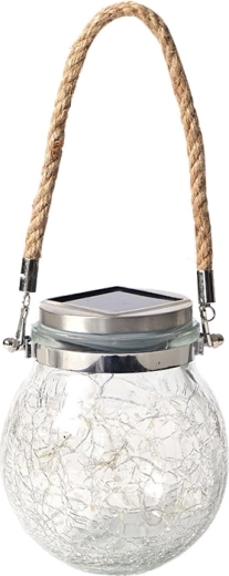 Stilfuld solcellelygte i form af en glas-"mason jar" med krakeleret glas, der skaber hyggeligt, ambient lys efter mørkets frembrud. Takket være det integrerede panel oplades den i løbet af dagen og tænder automatisk om aftenen. Den har et praktisk rebhåndtag til ophæng på gren, pergola eller gelænder og varm hvide LED indeni for en romantisk atmosfære uden kabler og energiomkostninger.