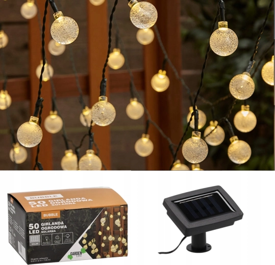 Skab en magisk stemning på altan, terrasse og i haven med den solardrevne lyskæde Bubble. Den byder på 50 LED med varmt hvidt lys, en samlet længde på 9,35 m og energibesparende solcelle-drift uden behov for stikkontakt. Takket være IP44 er den vejrbestandig og ideel til udendørs dekoration hele sæsonen.