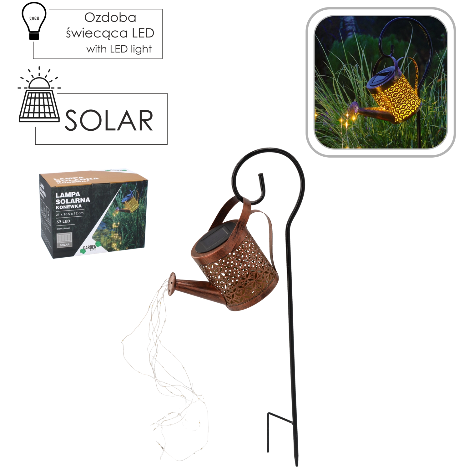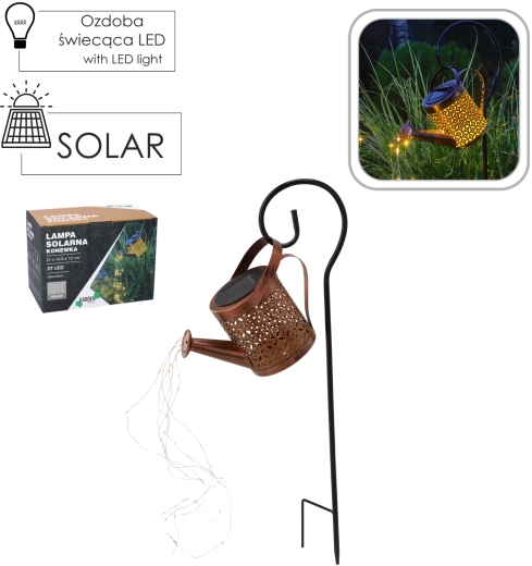 Lampen har 37 LED i varm hvid, som ved fuld opladning lyser i cirka 6–7 timer. Den leveres med en genopladelig NI-MH-akkumulator, IP44-beskyttelse mod vandsprøjt samt en praktisk krog på en nedstiks-ophængsstang med en samlet højde på ca. 80 cm. Den kompakte vandkande (21 × 10,5 × 12 cm) er let at placere i bede, ved havedamme eller på terrassen.