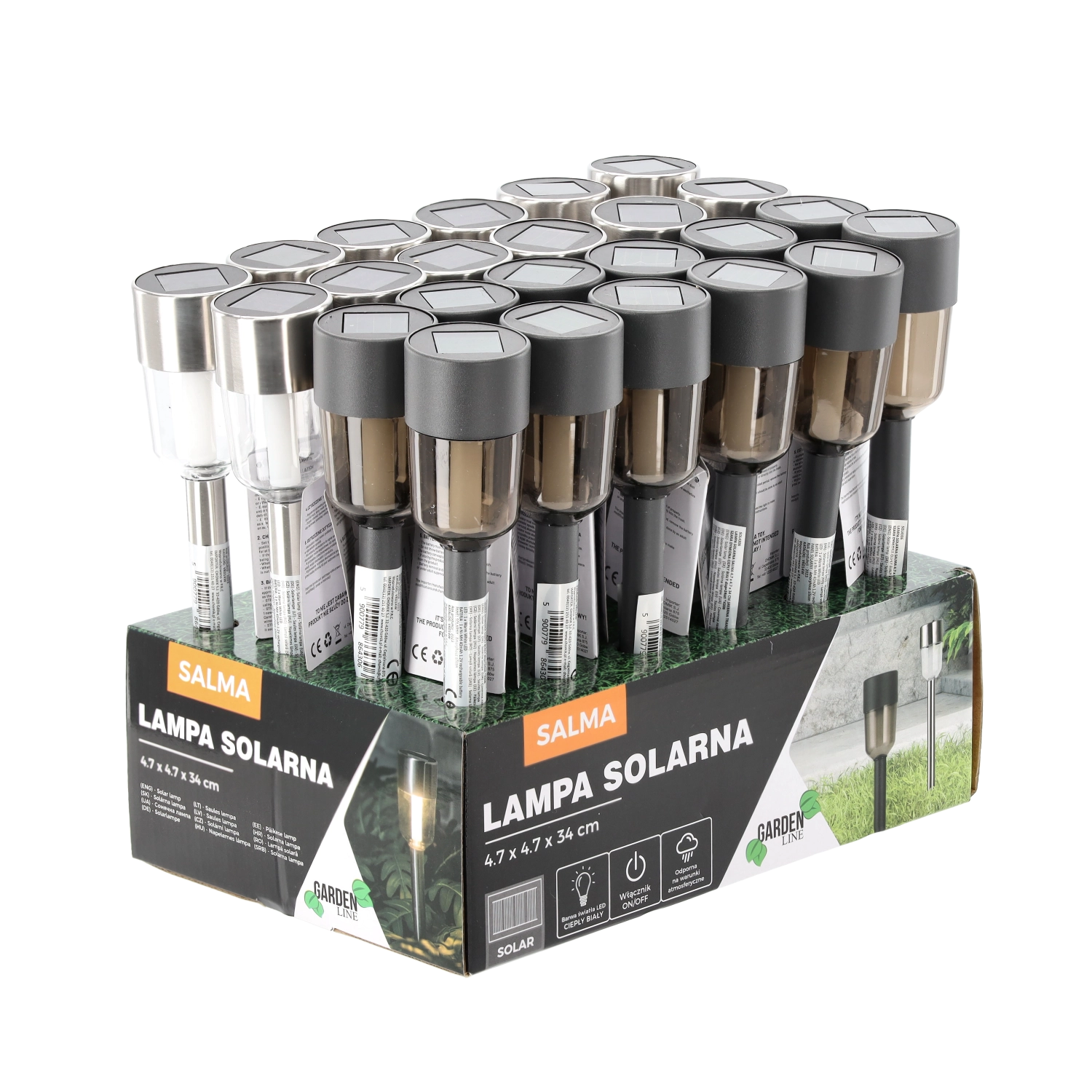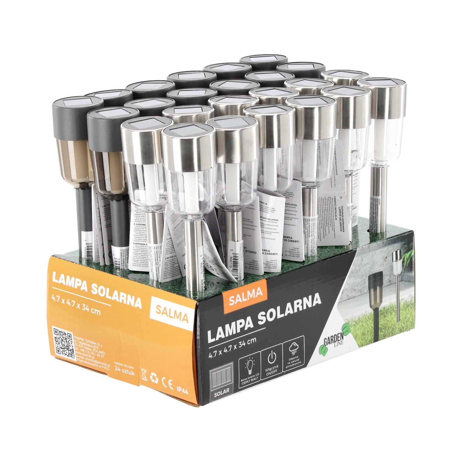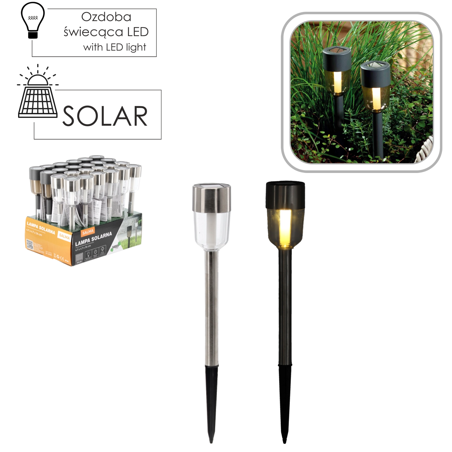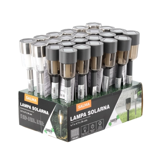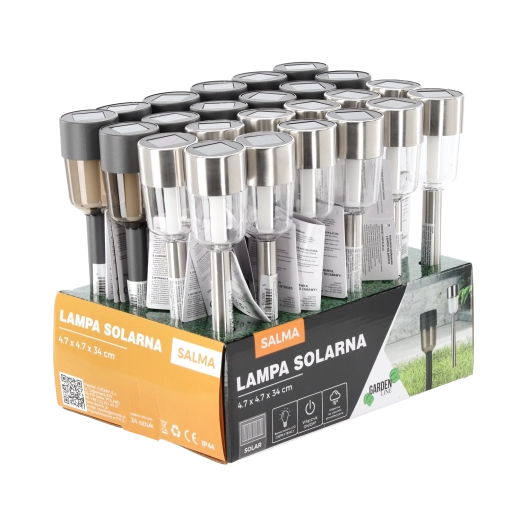 Elegant solcelledrevet havelampe SALMA med hus i rustfrit stål og robust plast, som giver varmt hvidt lys for en hyggelig atmosfære langs stier, på terrassen eller ved indgangen. Takket være solcelledrift behøves ingen kabler eller ekstra omkostninger; den oplades automatisk i solen og tænder om aftenen. IP44-beskyttelse sikrer drift i al slags vejr, og nem installation med jordspyd sparer tid.
