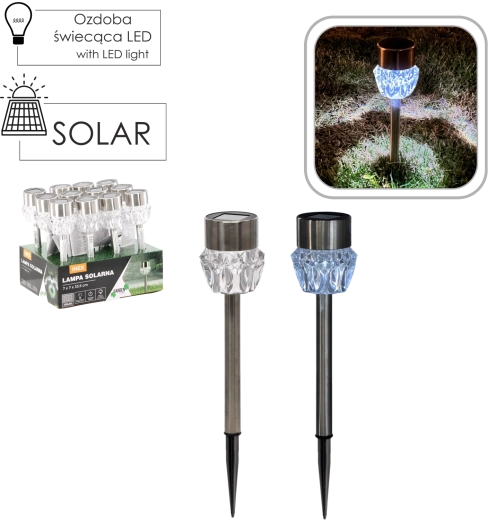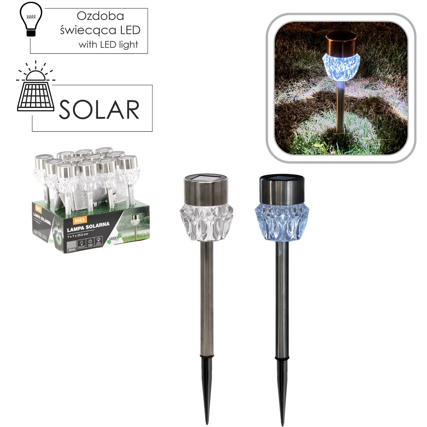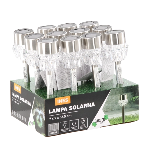Elegant solcelledrevet havelampe INES med sølvfarvet kabinet og en dekorativ linse oplyser stier, terrasser og bede. Takket være solcelledrift kræver den hverken kabler eller ekstra omkostninger, tænder automatisk ved skumring og leverer koldt hvidt LED-lys. Beskyttelsesklasse IP44 sikrer drift i al slags vejr.