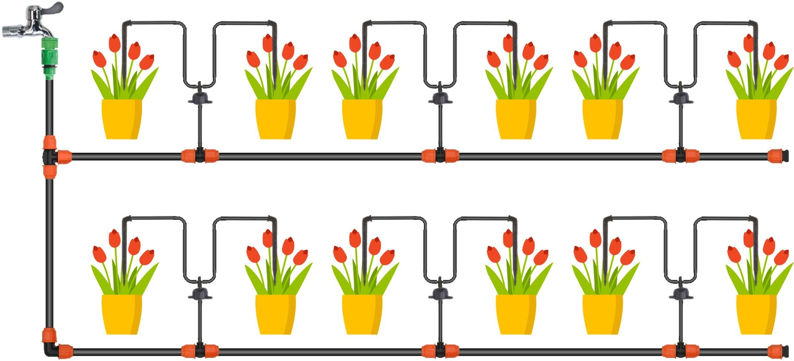 Hurtig tilslutning til havehane og hurtigkobling giver nem start og stop af vandingen. To slangestørrelser (9×12 mm og 4×7 mm) med reducerende T-stykker gør det muligt at etablere en hovedledning og fine forgreninger til hver plante. Der medfølger også PTFE teflontape til tætte gevind og clips til fastgørelse af slanger.