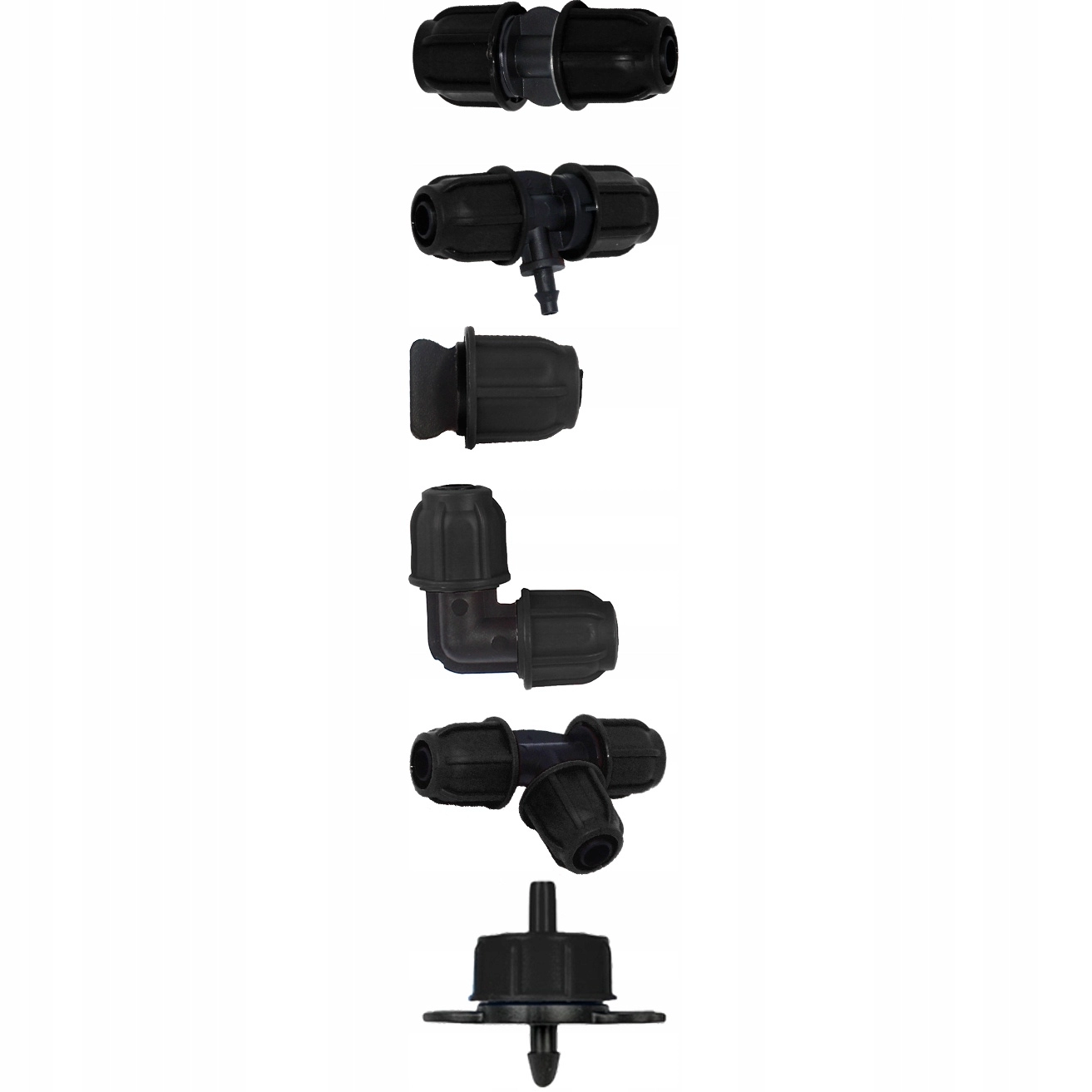 T-stykker, albuer, samlinger og endestykker til enhver forgrening. 10 dryppere med spyd for målrettet vanding af hver enkelt plante.