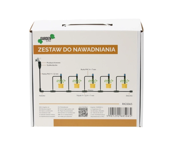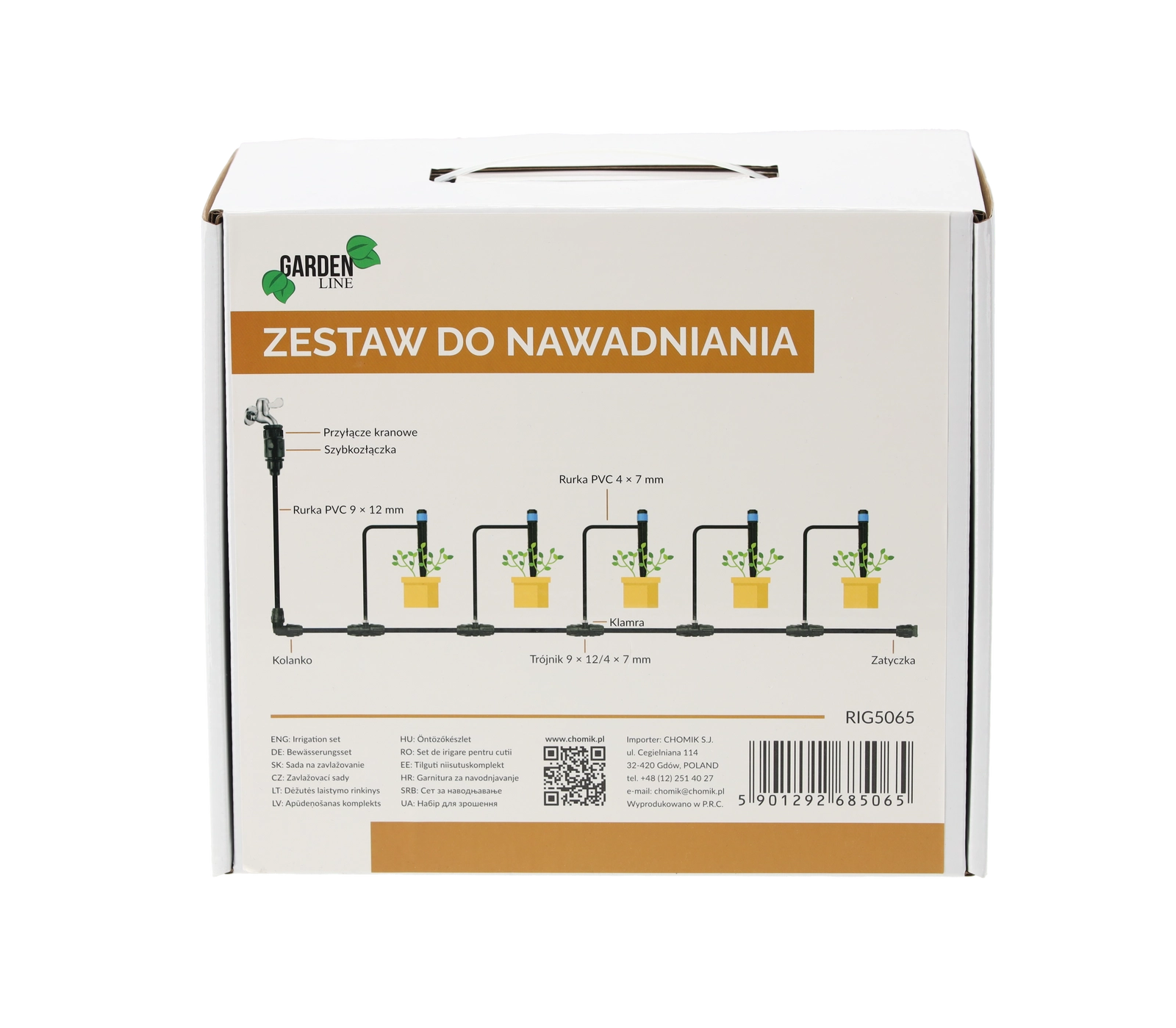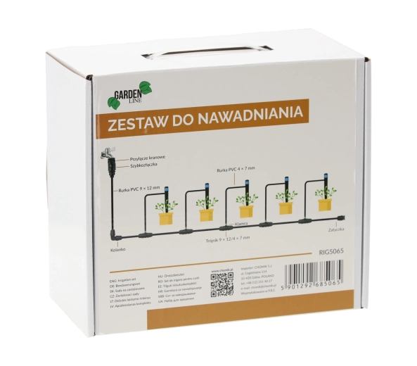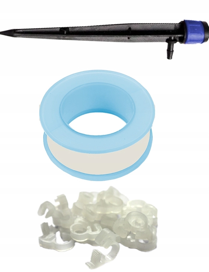 I pakken finder du slanger 9×12 mm og 3×5 mm, koblinger, T-stykker, en albue, endestykker, lynkobling, hanetilslutning, 15 dryppere og 15 clips til nem fastgørelse af ledninger. PTFE-tape hjælper med at tætne gevindsamlinger perfekt og forhindre lækager.