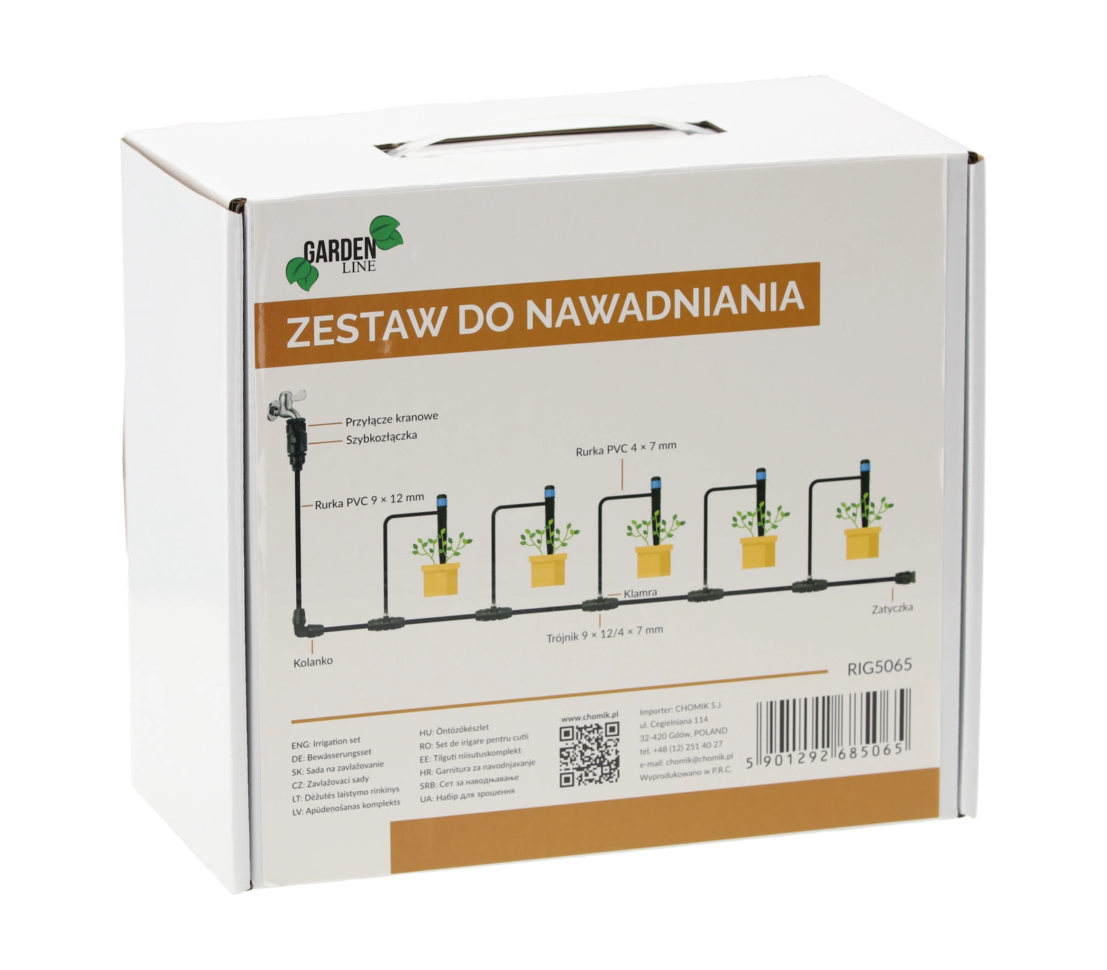 Alt du behøver i én kasse: dryppere, slanger, koblinger, T-stykker, ender og PTFE-tape. Samles og startes på få øjeblikke.