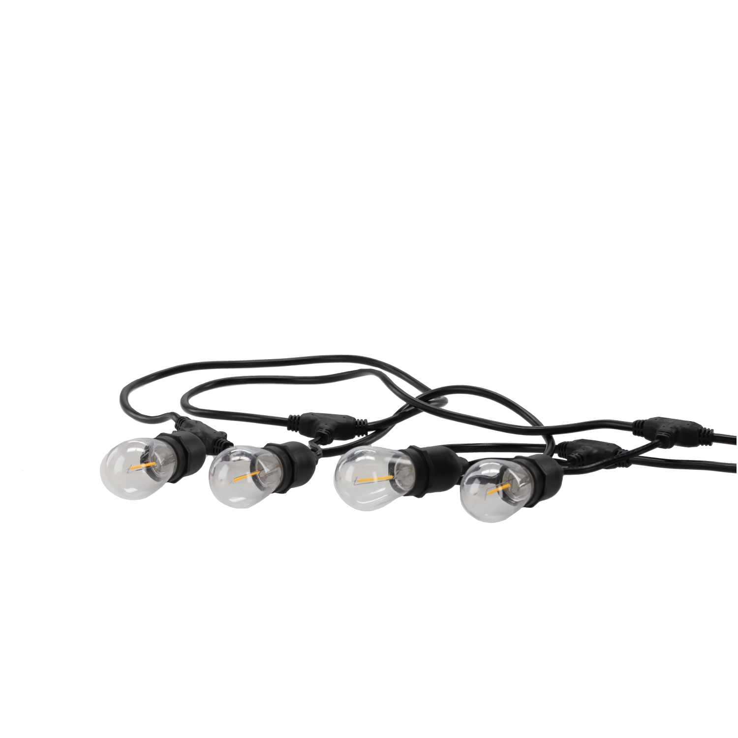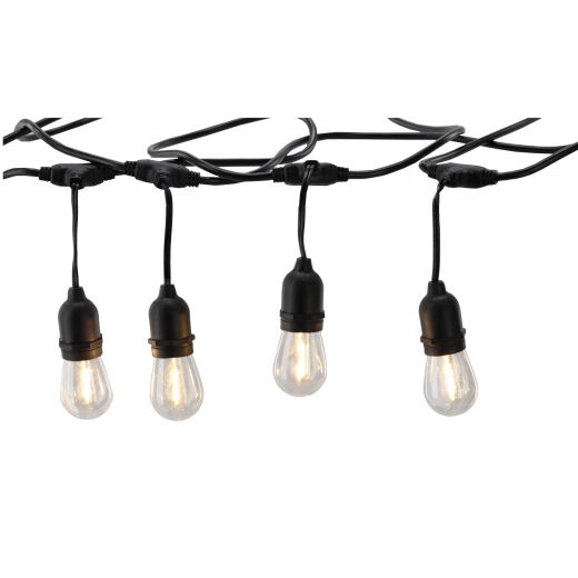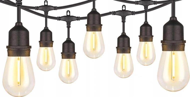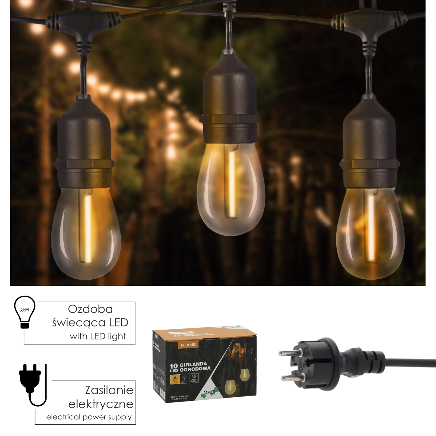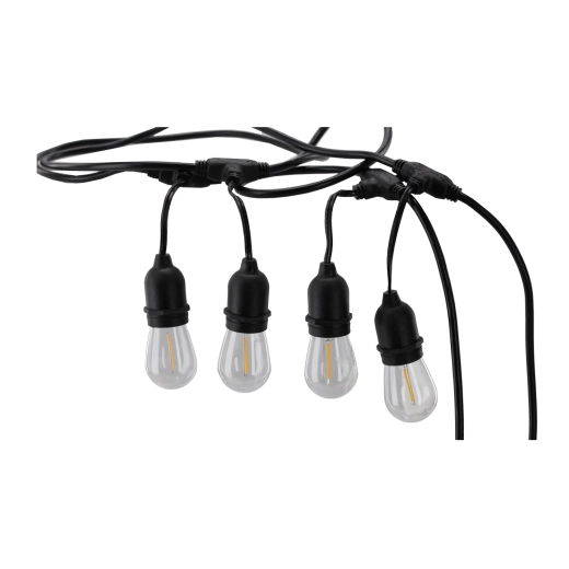 Takket være IP44-beskyttelse er kæden modstandsdygtig over for fugt og vejrpåvirkninger. LED-pærer E27 (1 W/stk.) sparer energi og giver samtidig et stilfuldt vintage-udtryk med filament-look. Afstand 0,7 m mellem fatningerne sikrer en jævn lysfordeling.