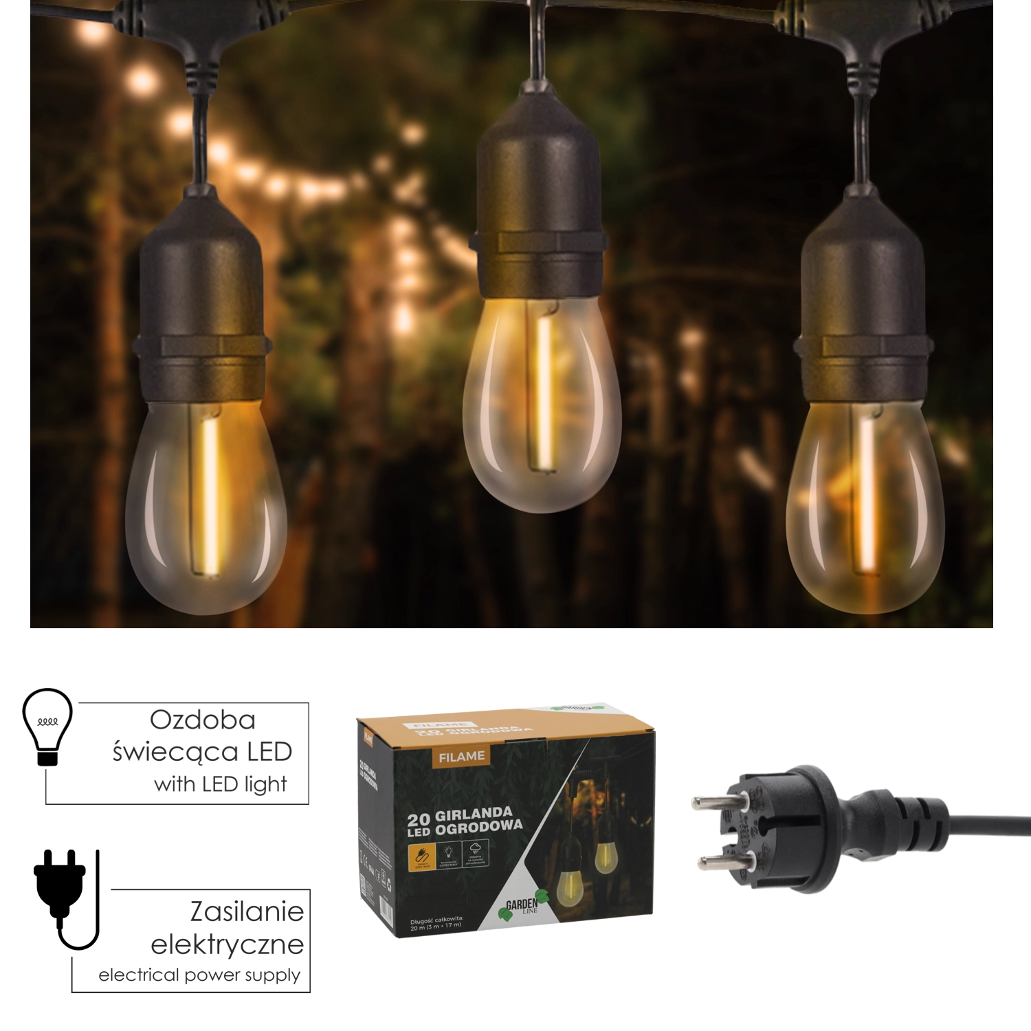 Installationen er nem og sikker. Guirlanden har en praktisk strømførende del og en lyssektion med holdere ved soklerne, så du let kan fastgøre den under pergolaen, langs gelænderet eller i trækronerne.