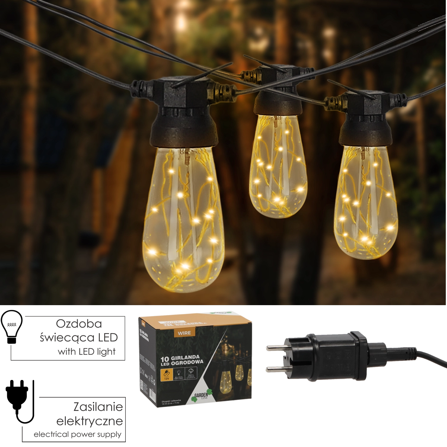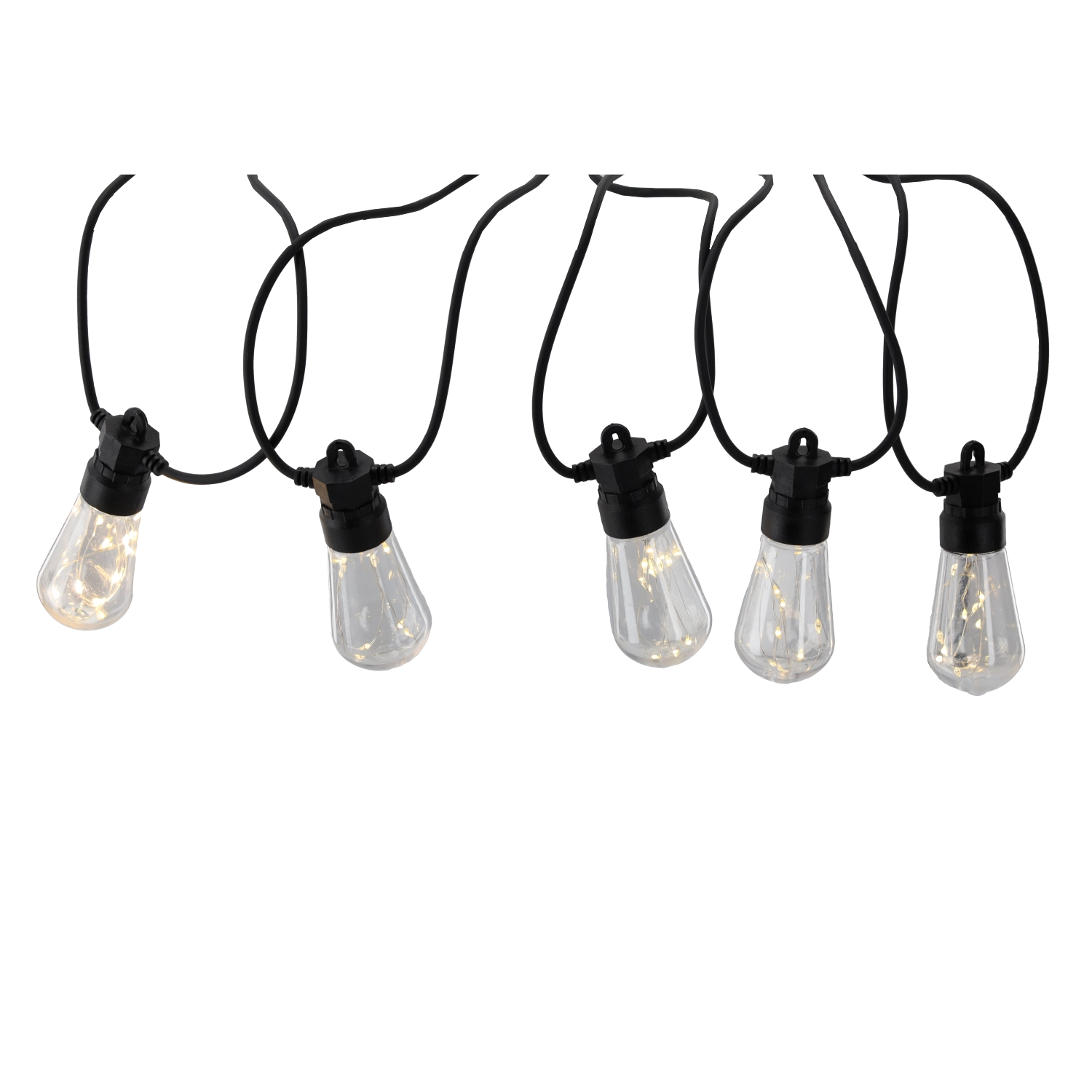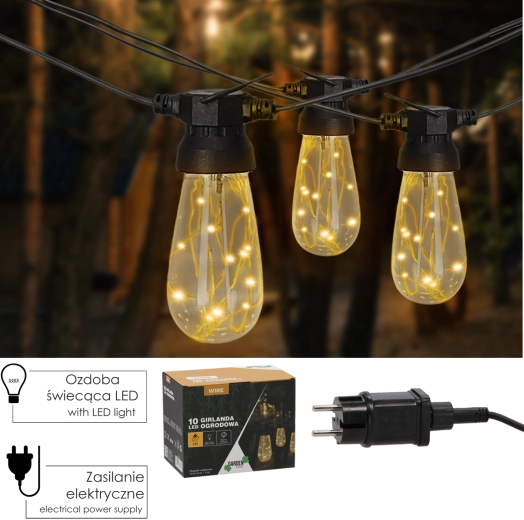 Stilfuld udendørs lysguirlande på 10 m med 10 energibesparende LED i varm hvid (3000 K), som skaber en hyggelig atmosfære på terrasse, altan og i haven. Takket være vandtæthed IP44 og sikker 12 V strømforsyning er den ideel til udendørs brug. Nem installation sikres af praktiske beslag, og muligheden for sammenkobling af op til 2 sæt udvider lysdekorationen præcis efter dine behov.