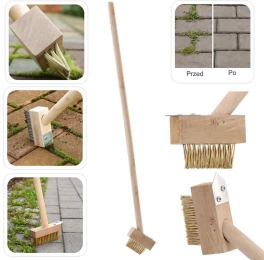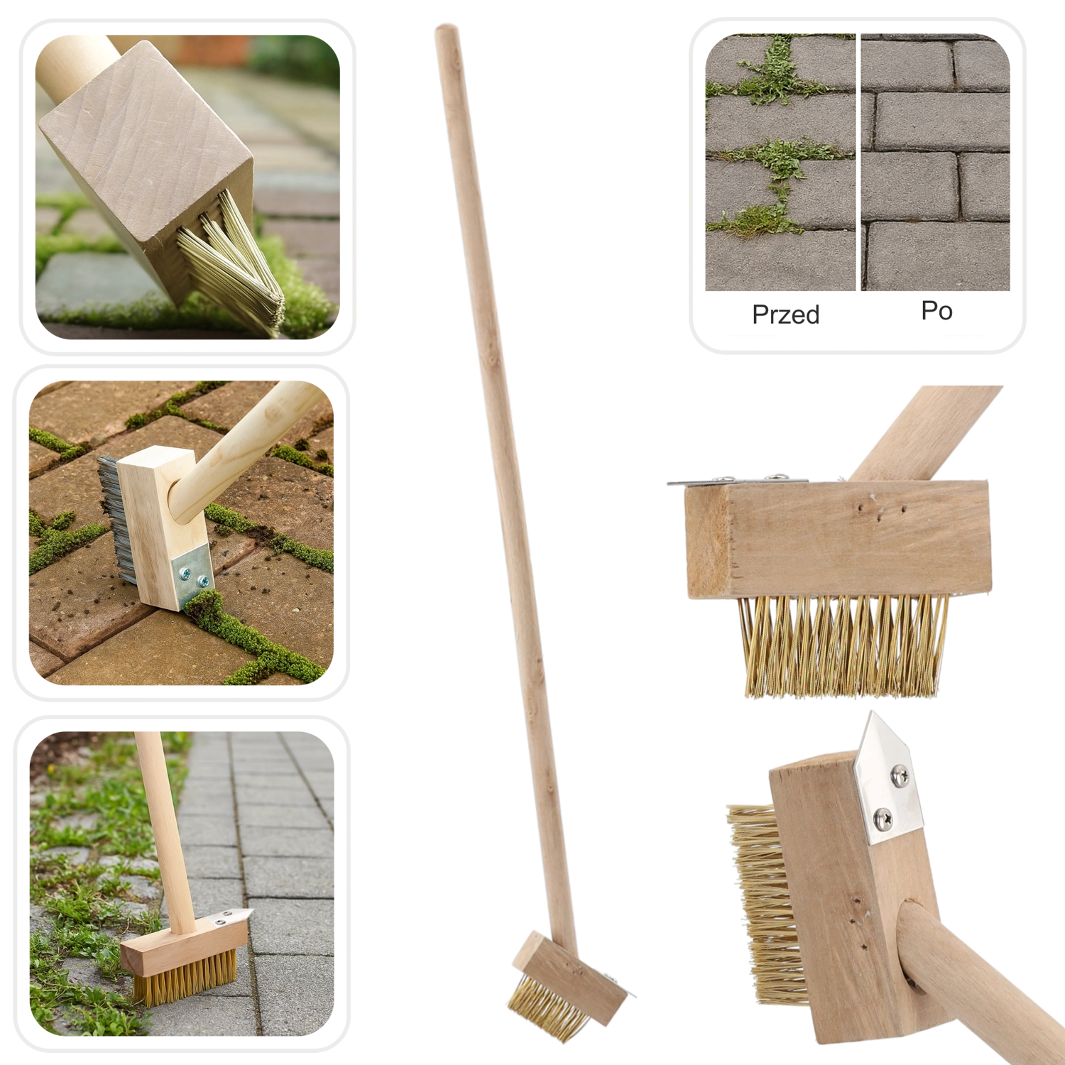 Hold stier, terrasser og gangarealer fri for mos og ukrudt hurtigt og uden besvær. Denne børste med stærke metalbørster og en trekantet stålskraber trænger dybt ned i fugerne, hvor den præcist løsner og fjerner snavs sammen med rødderne. Takket være det lange 120 cm træskaft kan du arbejde komfortabelt i oprejst stilling.