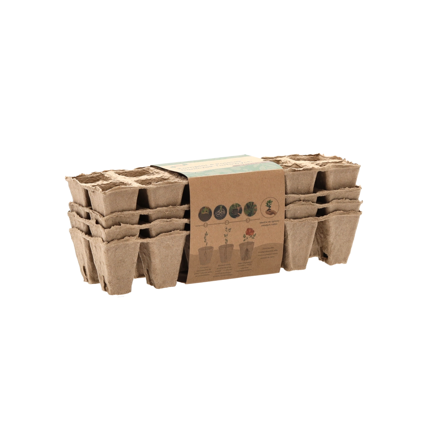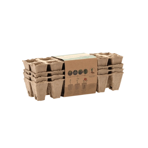 Bakker af presset papir- og tørvemasse kan plantes direkte i jorden. De nedbrydes naturligt og understøtter rodsystemet uden unødigt affald.