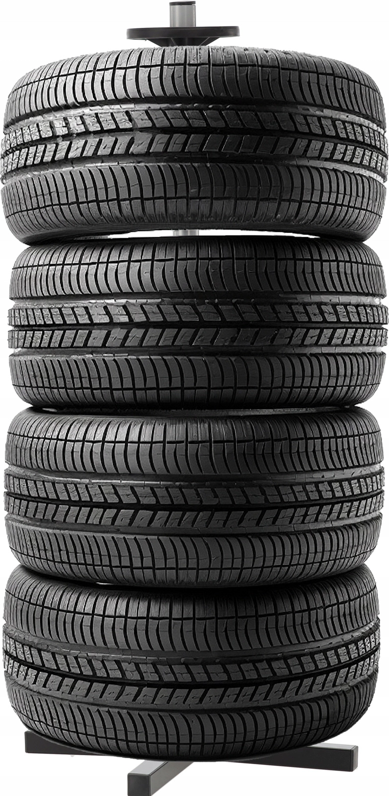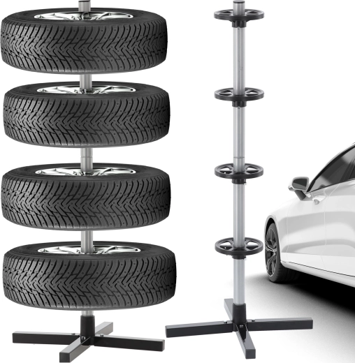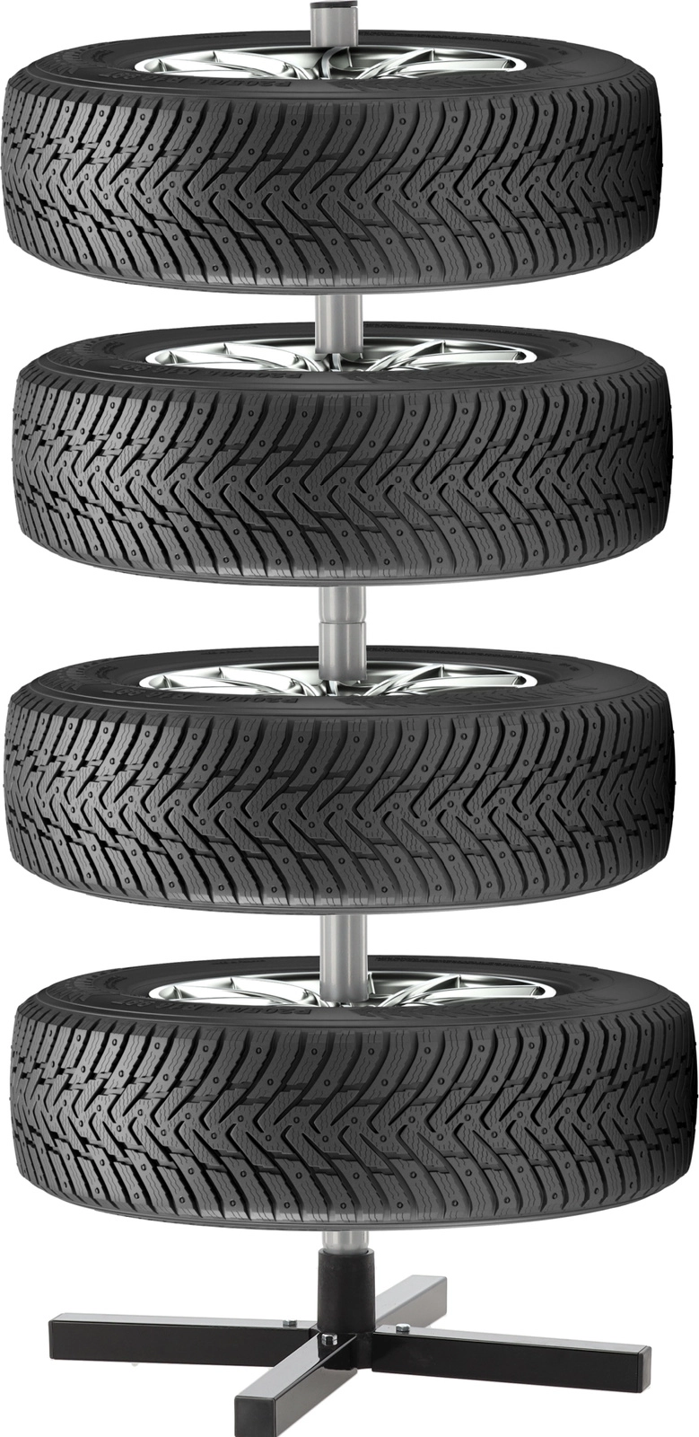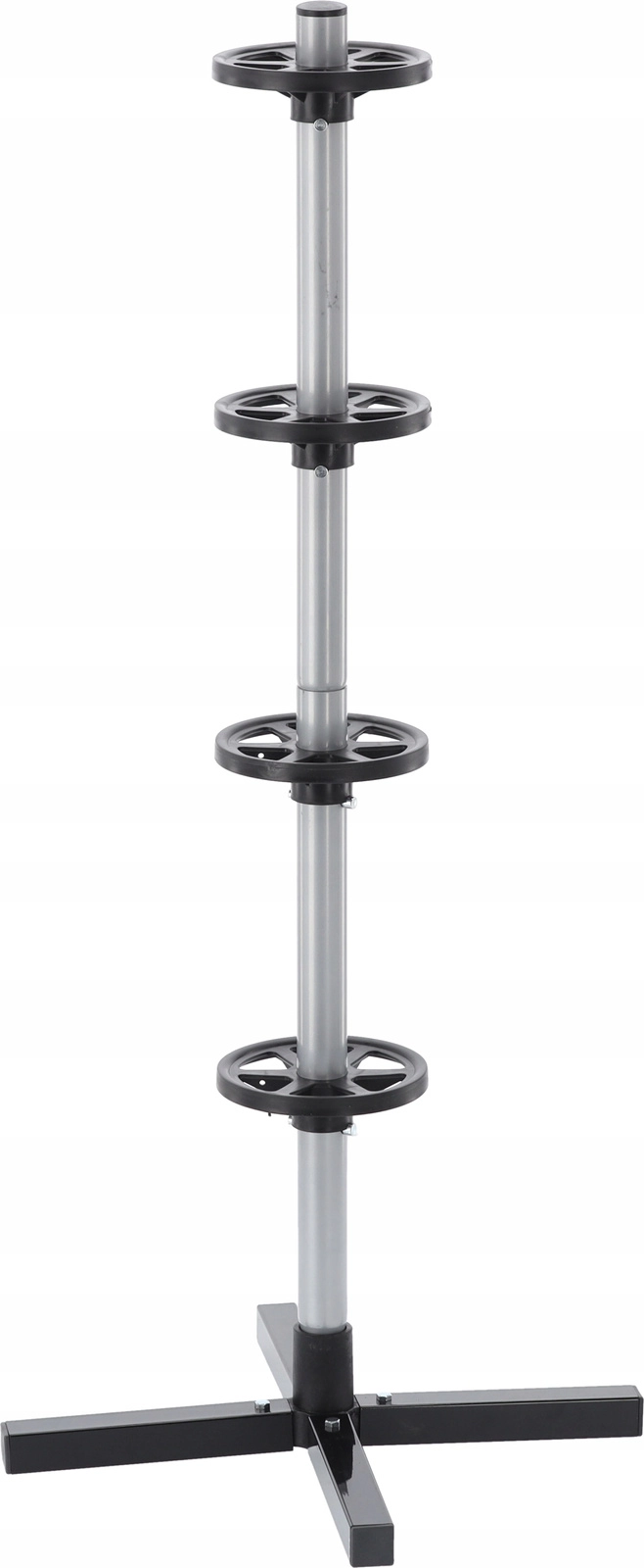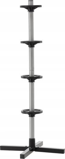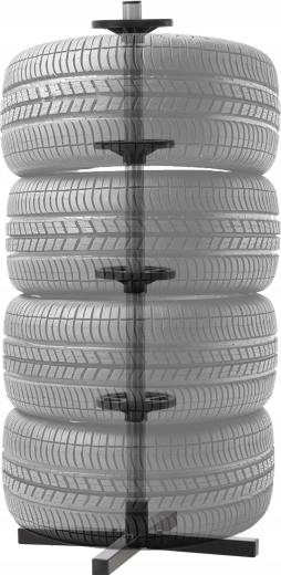 Opbevar dit sæsonsæt af dæk overskueligt og sikkert. Det vertikale stativ med krydsfod holder op til fire hjul fri af gulvet, hvilket sparer plads og forhindrer trykmærker på slidbanen. Robust stål, afstandsringe og en stabil base sikrer stabilitet selv ved fuld belastning.
