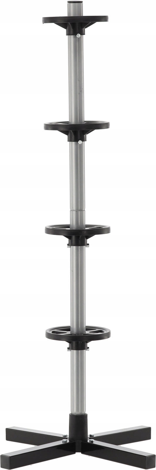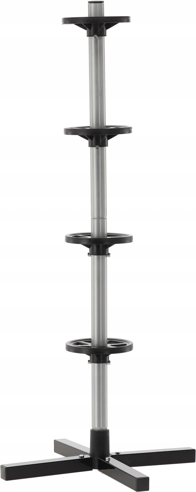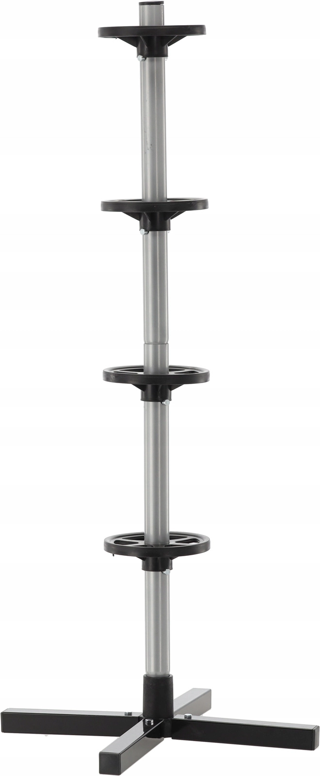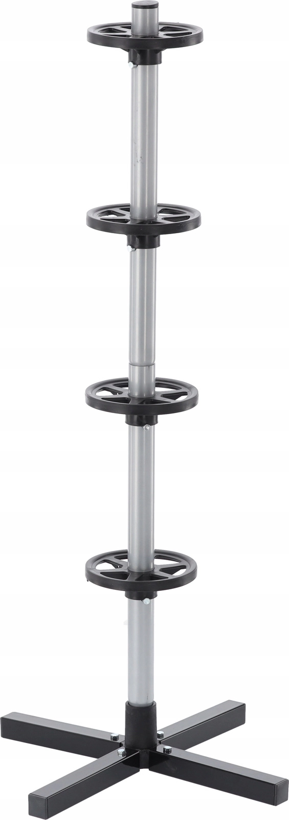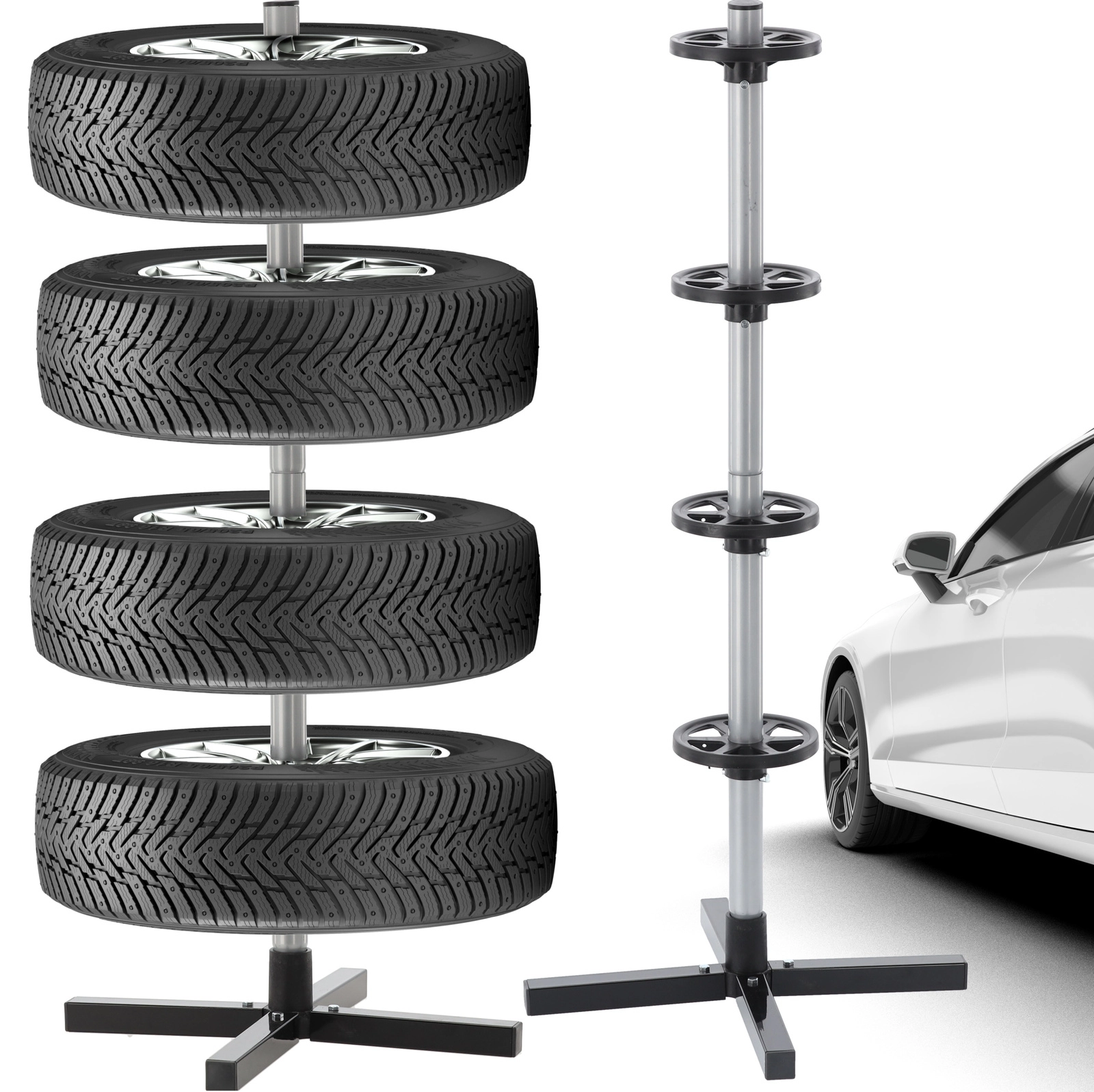 Opbevar dit sæsonsæt af dæk overskueligt og sikkert. Det vertikale stativ med krydsfod holder op til fire hjul fri af gulvet, hvilket sparer plads og forhindrer trykmærker på slidbanen. Robust stål, afstandsringe og en stabil base sikrer stabilitet selv ved fuld belastning.