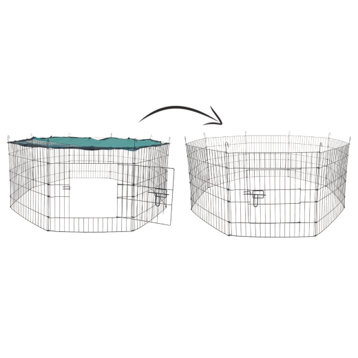 Praktisk løbegård til hunde, katte, kaniner og andre smådyr kombinerer en stabil stålkonstruktion og et skyggenet til beskyttelse mod solen. Med 8 paneler i størrelsen 56 × 57 cm kan du nemt tilpasse formen på arealet. Nem montering/afmontering, holdbar udførelse og kompakte mål er ideelle til have, sommerhus og rejser.