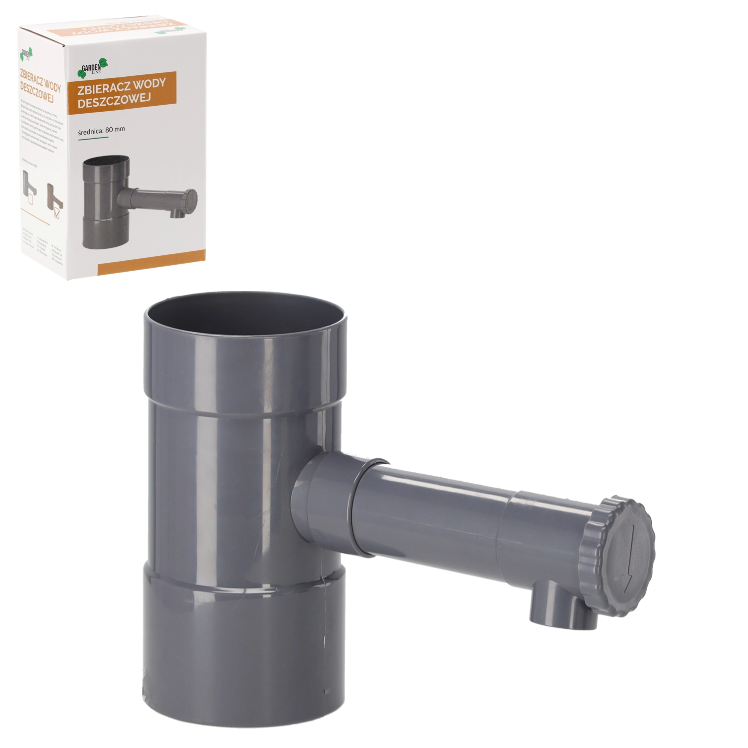 Grå regnvandsopsamler til nedløb med en diameter på 80 mm fanger en del af vandstrømmen fra tagrenden og leder den til en tønde eller beholder. Det robuste ABS‑plast tåler både vejr og UV‑stråling og er derfor ideelt til langvarig udendørs brug. Installationen er hurtig og uden komplicerede indgreb.