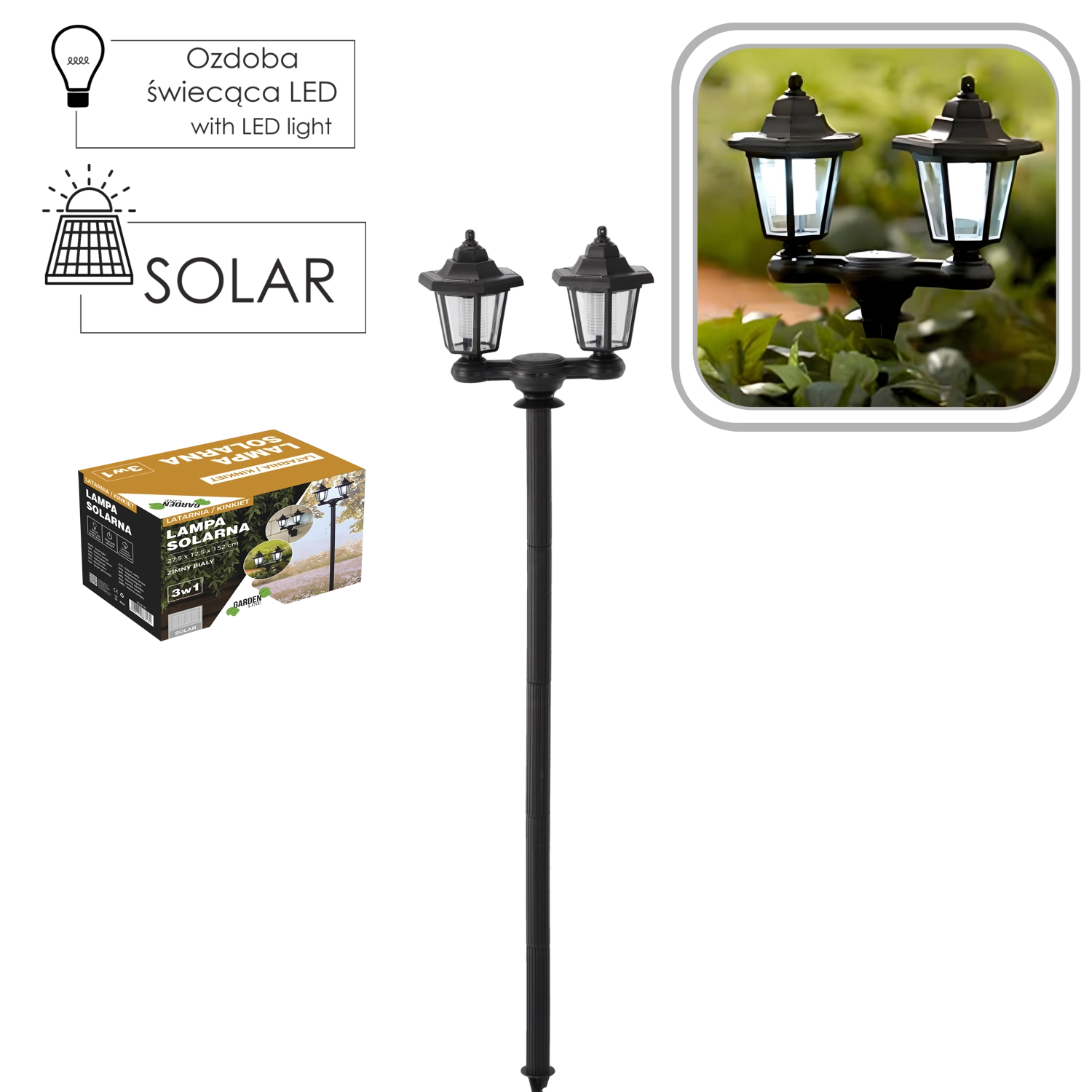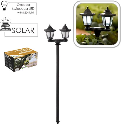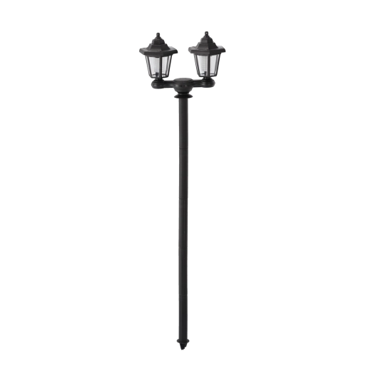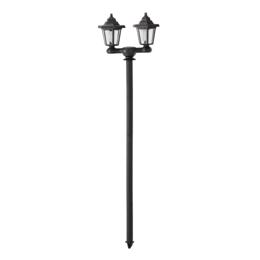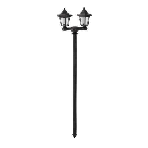 Denne alsidige solcellelampe kombinerer klassisk udseende med moderne effektivitet. To gennemsigtigt dækkede hoveder giver bredere lysdækning til stier, indkørsler eller terrasser, og hvert hoved kan skrues af og bruges som væglampe. Uden kabler, med automatisk opladning og drift ved skumring er den ideel til vedligeholdelsesfri udendørs belysning.