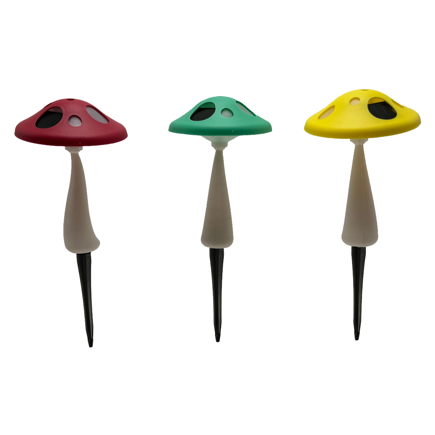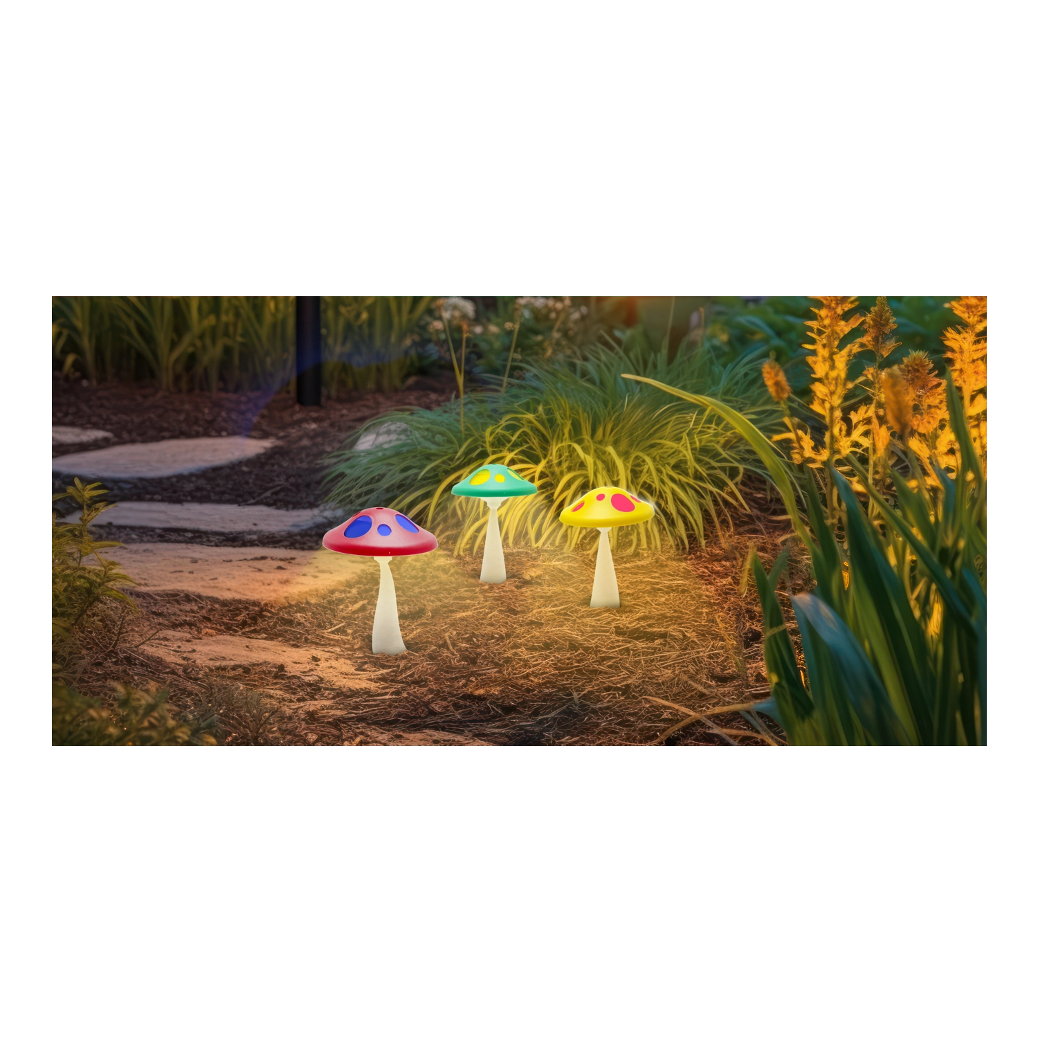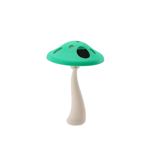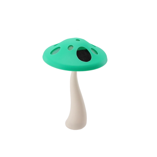 - Legende svampedesign i rød, grøn eller gul, der klæder havens grønne omgivelser.