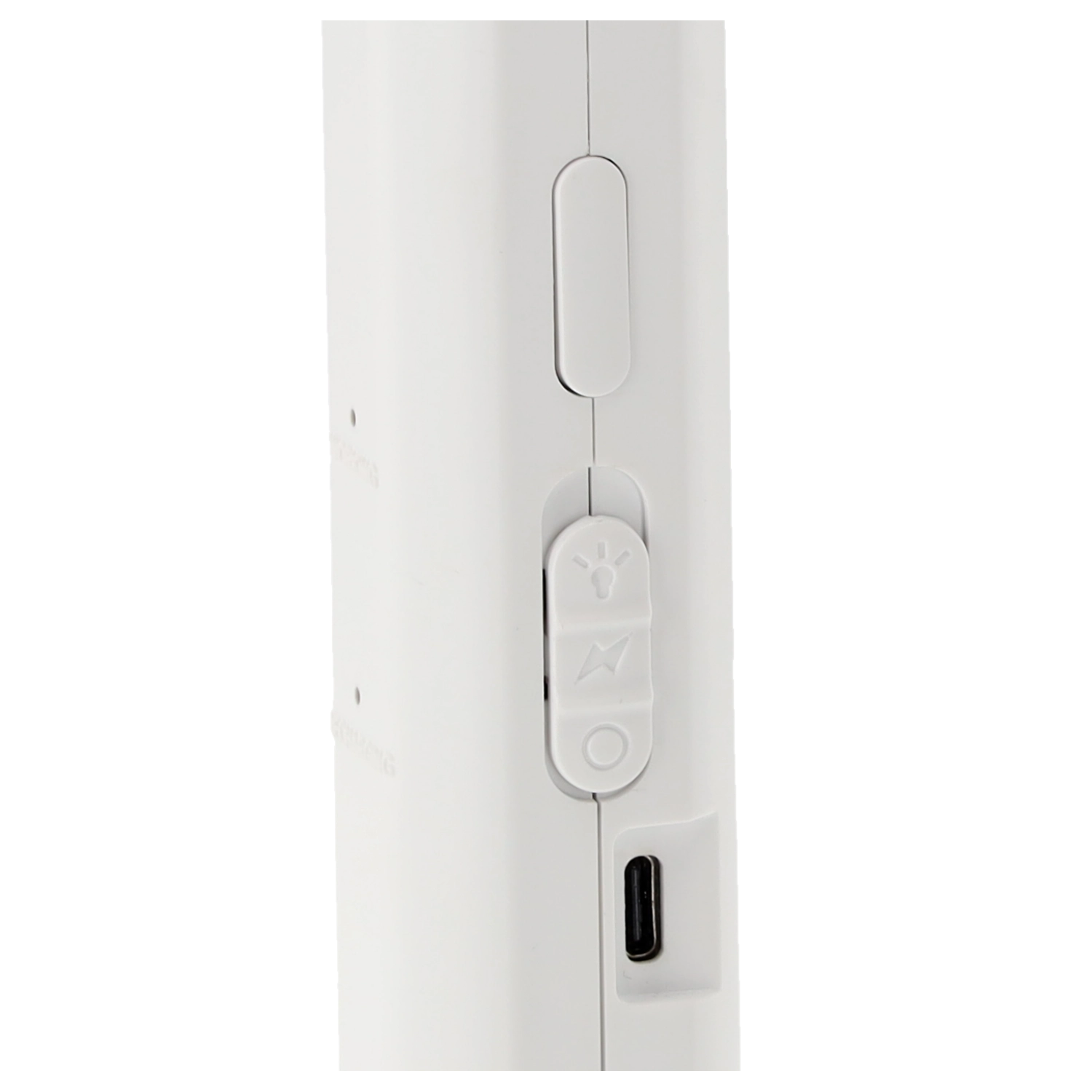 Takket være det integrerede Li‑ion-batteri på 800 mAh klarer den op til 5 timers drift, og opladning tager cirka 2–3 timer via det universelle USB‑C. Det robuste kabinet af HIPS-plast er let og behageligt at holde, og det medfølgende kabel gør opladning nem både hjemme og på farten.