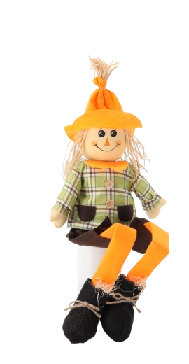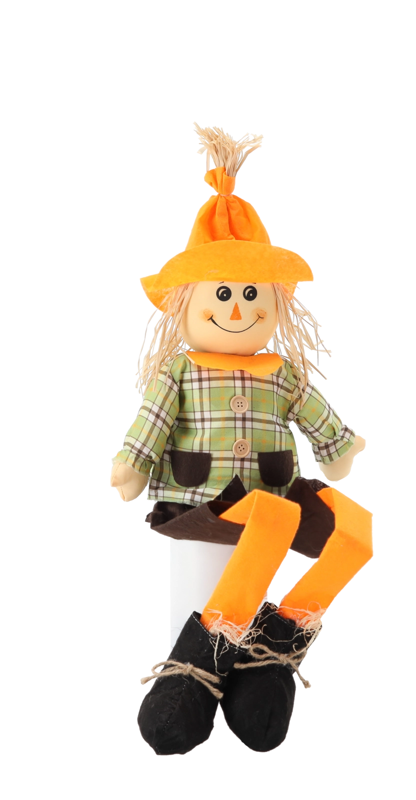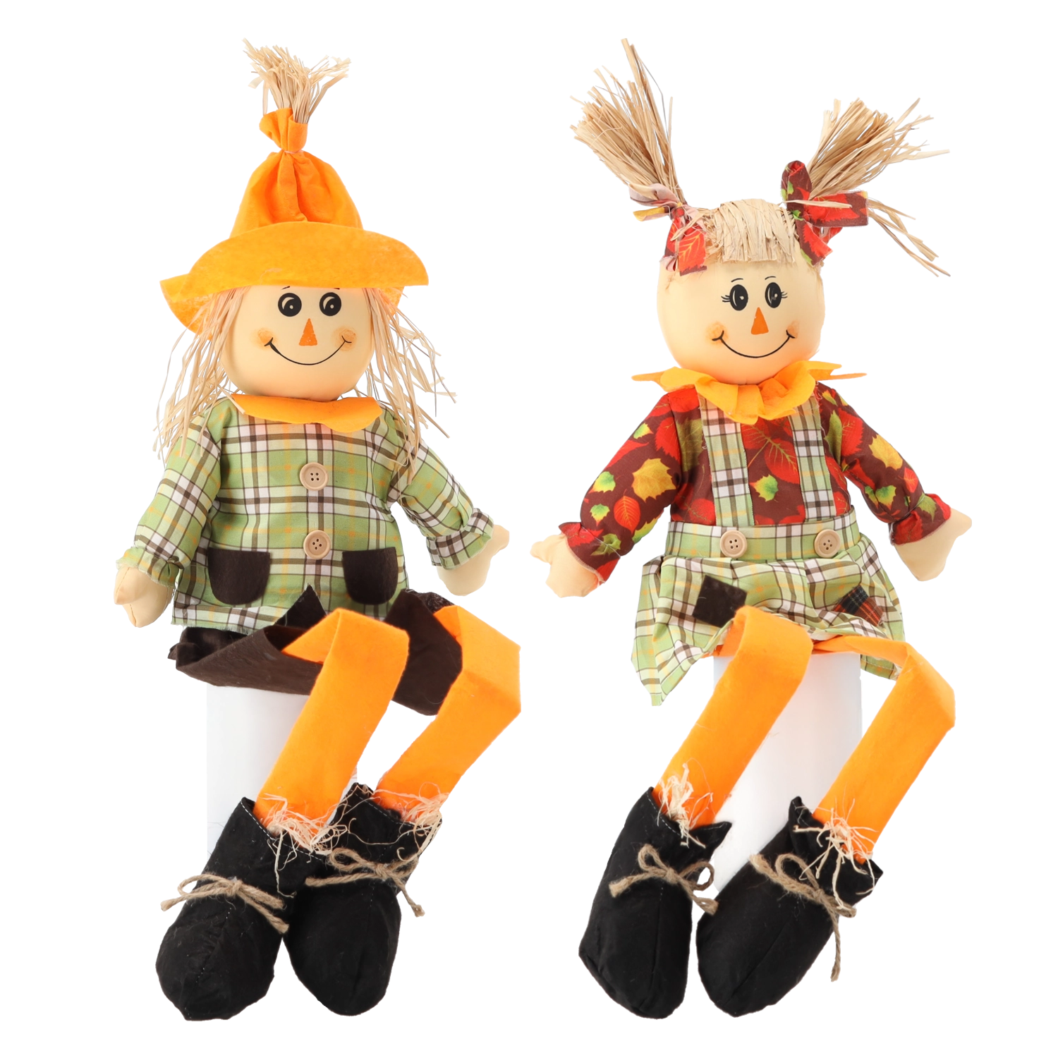 Et par siddende skræmsler med hængende ben passer perfekt på hylder, vindueskarme og entréborde og fremhæver efterårsstemningen.