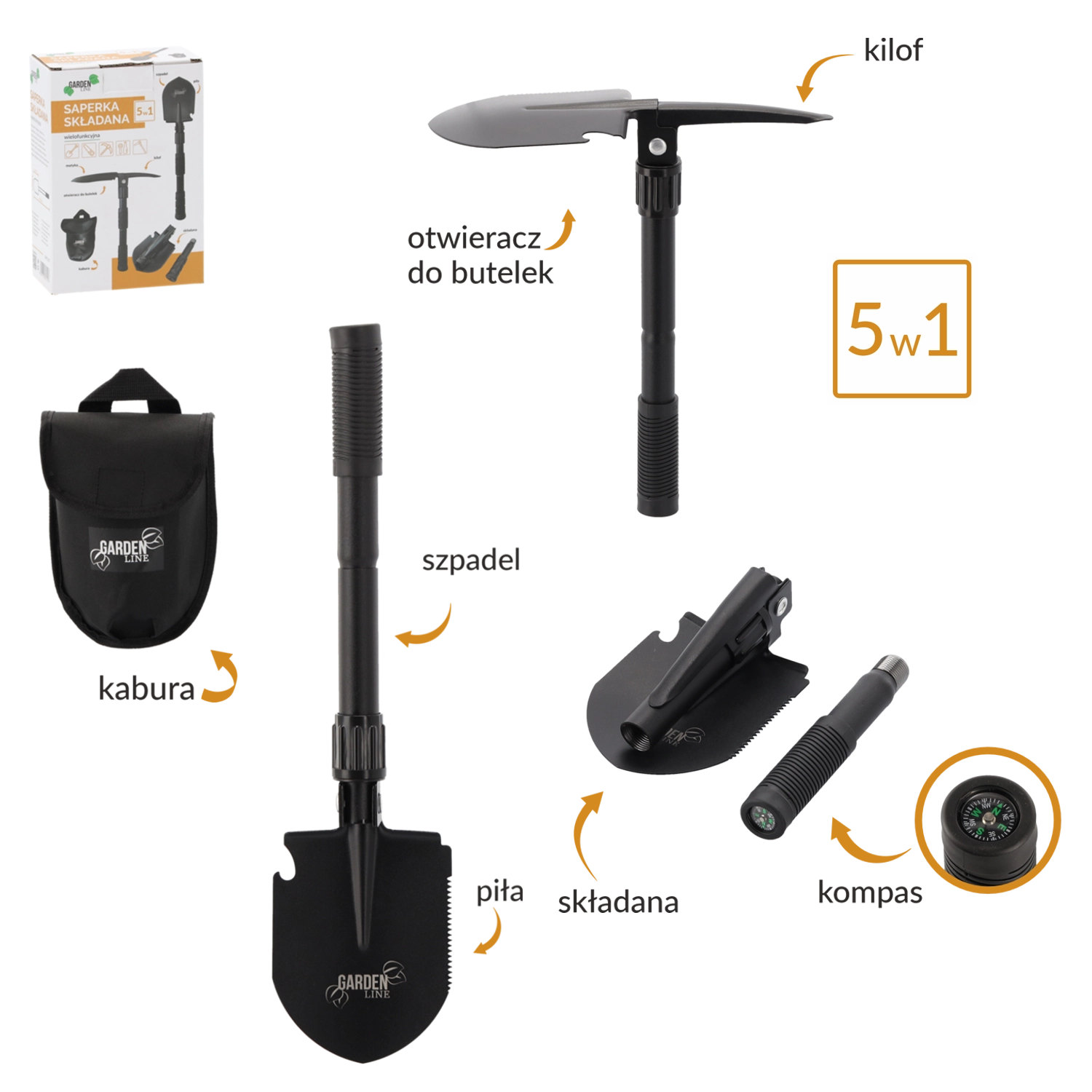Kompakt og robust sammenklappelig 5-i-1 spade til camping, survival, bil og have. Tilbyder gravning, hakke, sav, flaskeåbner og kompas. Takket være den sammenklappelige konstruktion passer den i rygsæk eller bil, og de slidstærke materialer sikrer lang levetid og pålidelighed i terrænet.
