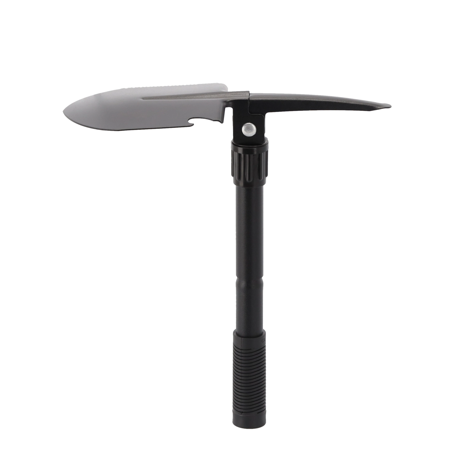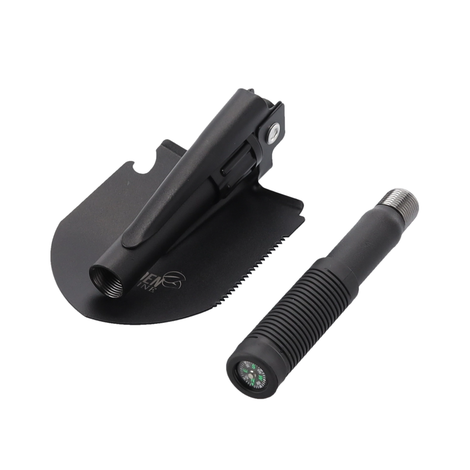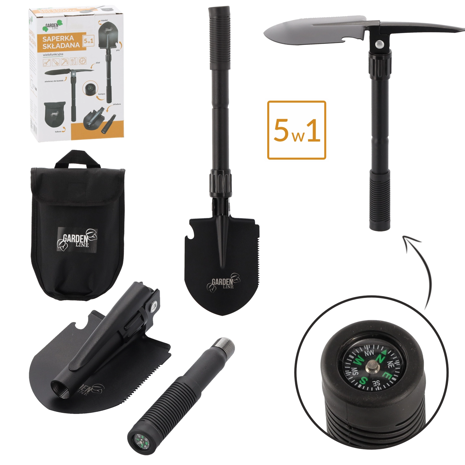 - 5-i-1: spade, hakke, savkant på bladet, flaskeåbner, kompas