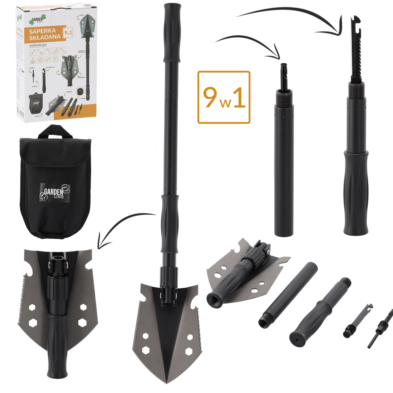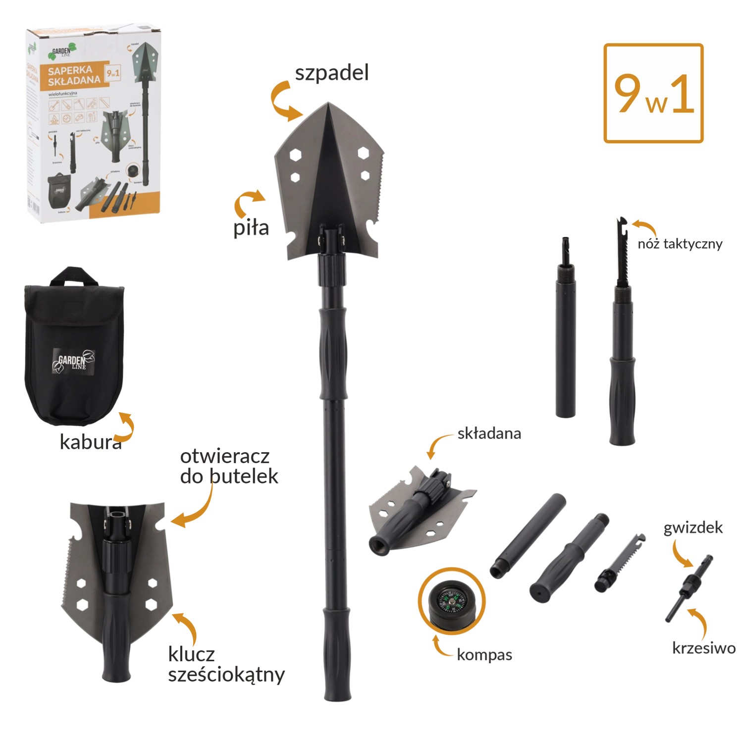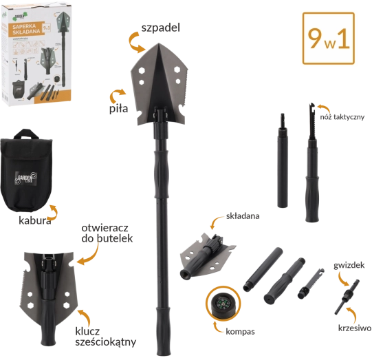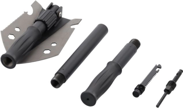 Gravning, brækning, skæring og optænding af bål. Skovl, hakke, sav, sekskantnøgle, oplukker, kniv, tændstål, fløjte og kompas – alt lige ved hånden.