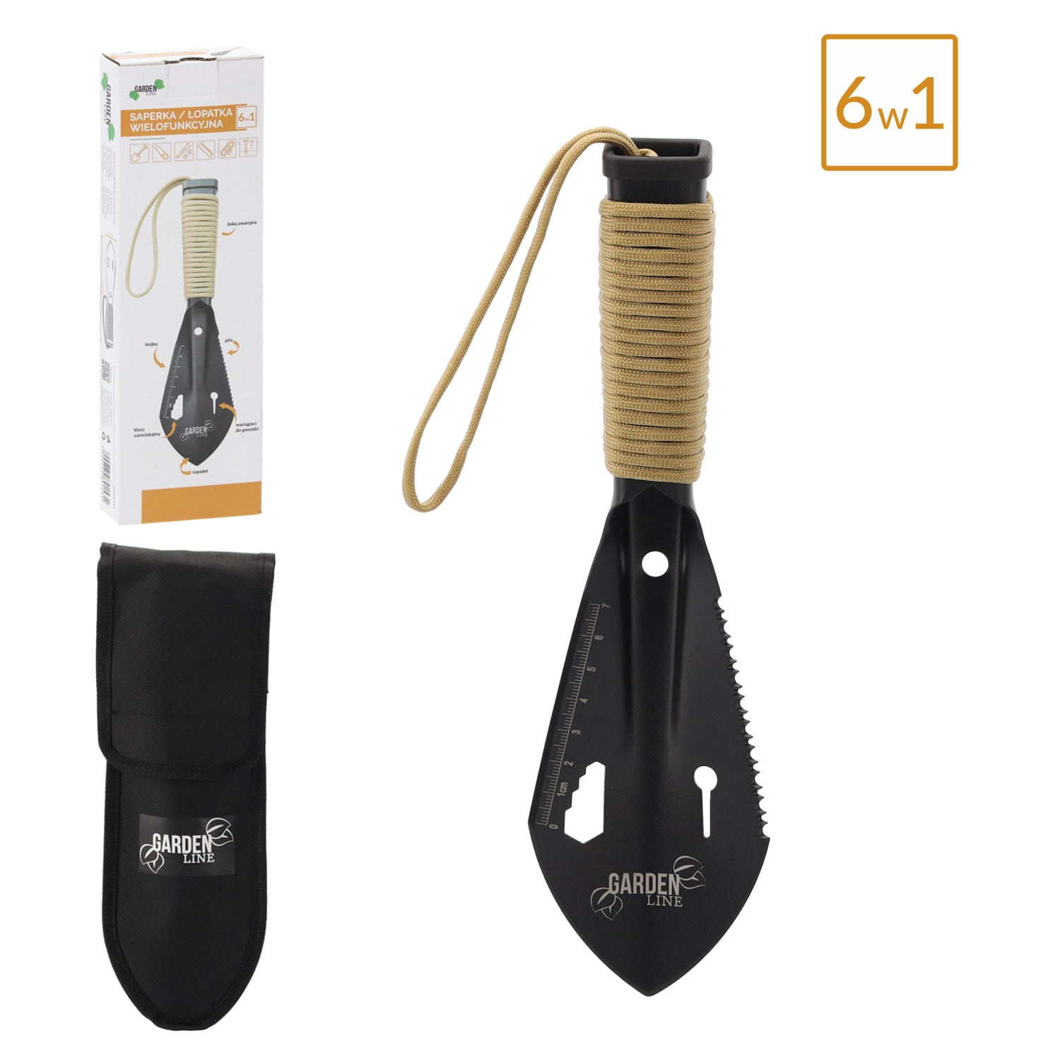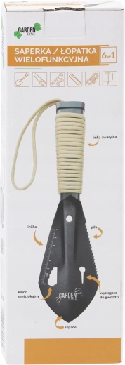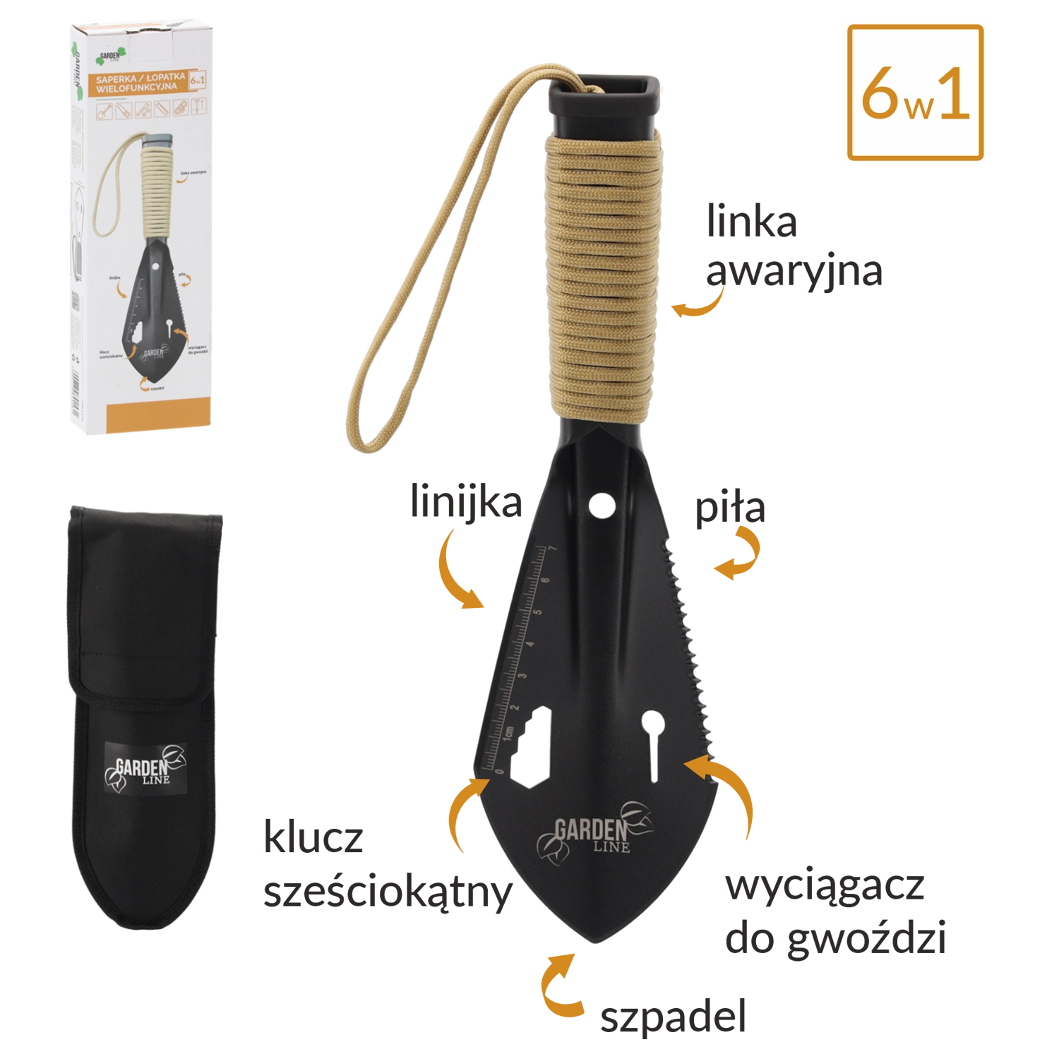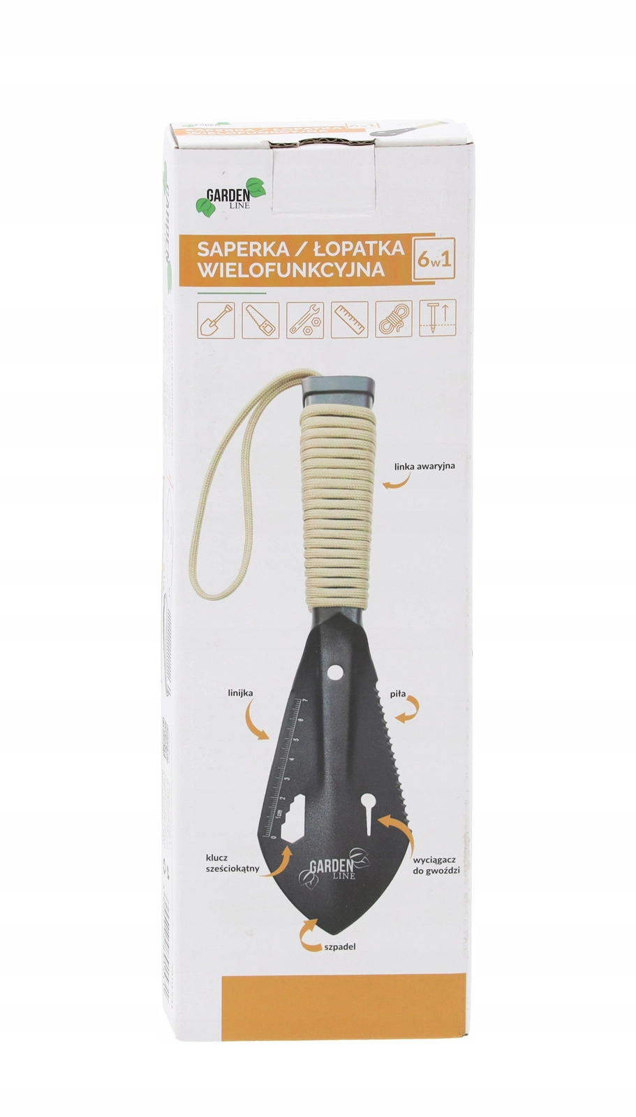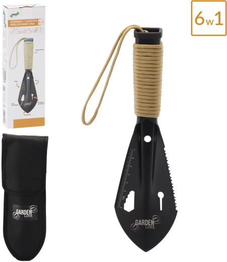 Værktøjets hoved kombinerer flere funktioner: skarp kant til gravning og opbrydning, savtænder til skæring af grene, integrerede sekskantnøgler til skruer, oplukker og mål i millimeter til hurtige målinger. Det medfølgende holdbare etui gør det nemt at bære sikkert i bæltet eller rygsækken.