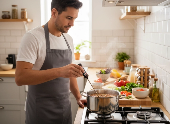 Den slanke metalsonde når nemt ind til midten af stegen og ned til bunden af gryden uden risiko for forbrænding.