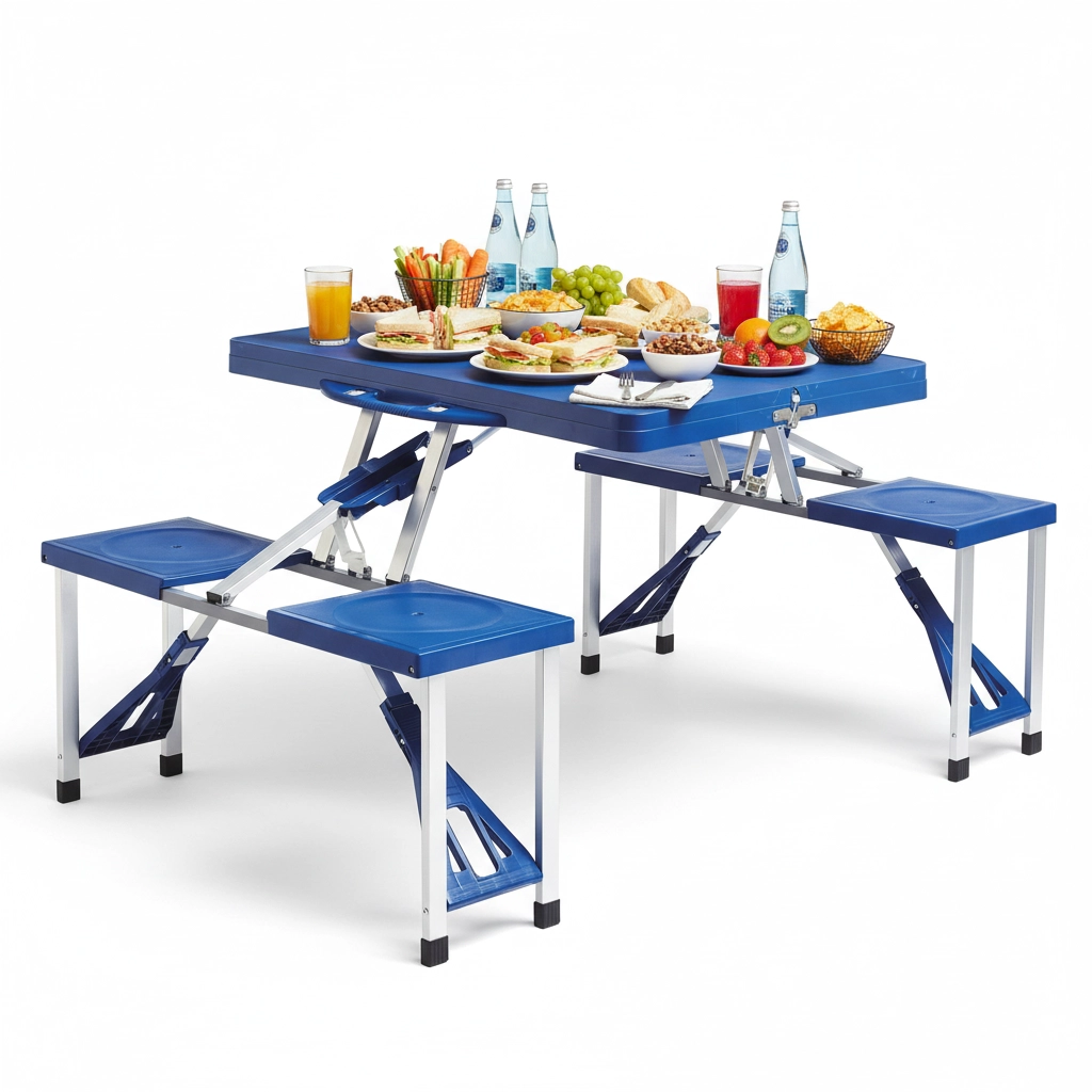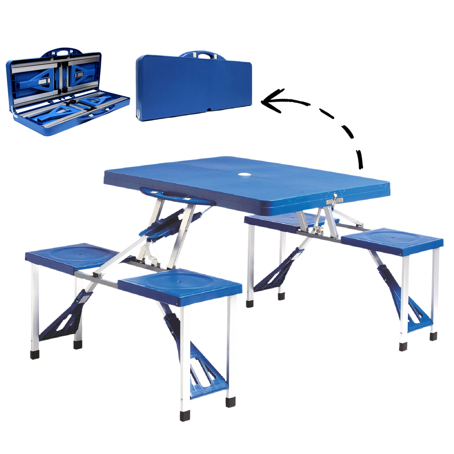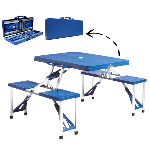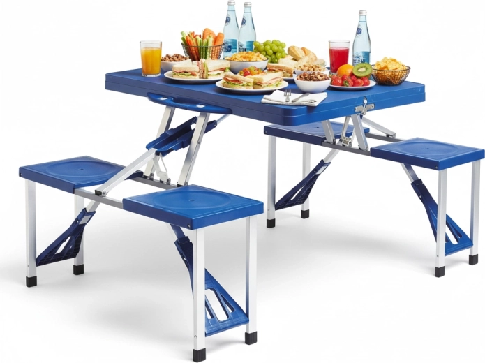 Praktisk og let sammenfoldeligt picnicbord med fire integrerede sæder i blå farve er ideelt til picnic, camping, haven og ved søen. Det foldes ud på få sekunder, bærer op til 150 kg, og takket være hullet til parasol kan du nyde behagelig skygge selv på varme dage.