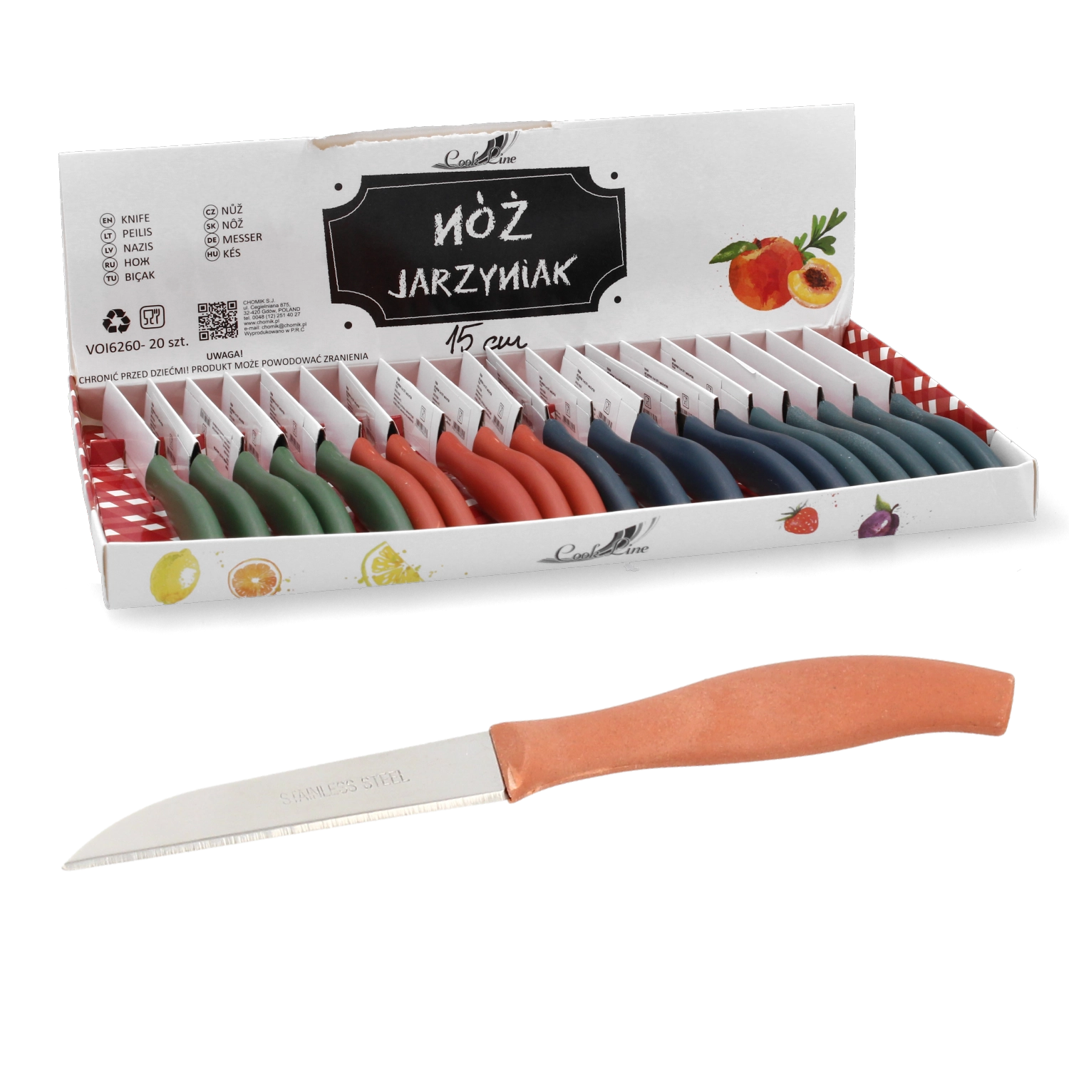 Praktisk grøntsagskniv med en klinge på 15 cm til præcis skæring af frugt og grønt. Det ergonomiske håndtag sikrer behagelig brug, og pakken indeholder hele 20 stykker – ideel til restauranter, catering og husholdninger. Universel klingelængde, pålidelig ydeevne og fordelagtig pakning til hverdagens arbejde i køkkenet.