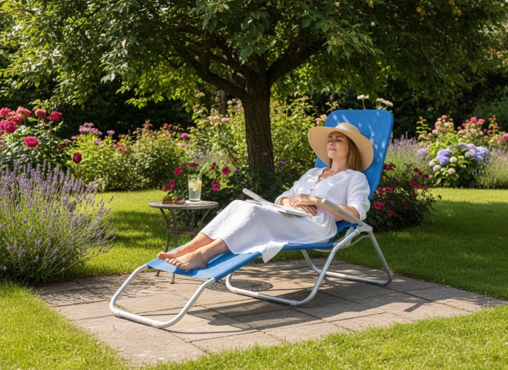 Den praktiske fodstøtte øger komforten selv ved længere tids afslapning. Vejrbestandige materialer muliggør nem vedligeholdelse, så solsengen forbliver pæn i lang tid. Den tidløse blå farve er let at kombinere med andet udendørsmøblement.