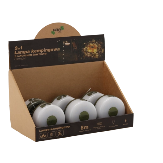 Praktisk, bærbar camping LED-lampe med ophængskrog og en lang 8 m lyskæde forvandler enhver campingplads, have eller pavillon til et behageligt oplyst sted. Varme hvide LED-dioder skaber en hyggelig atmosfære til både samvær og aftenfester.