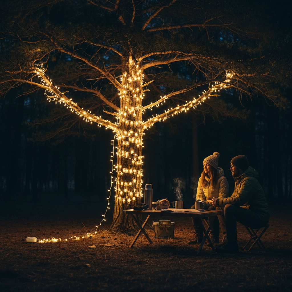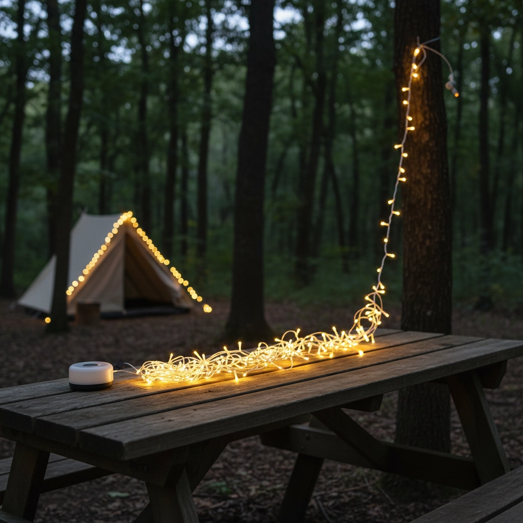 Det lette sæt sørger for både dekorativ og praktisk belysning af bord, telt eller pavillon – på få øjeblikke og uden besværlig montering.