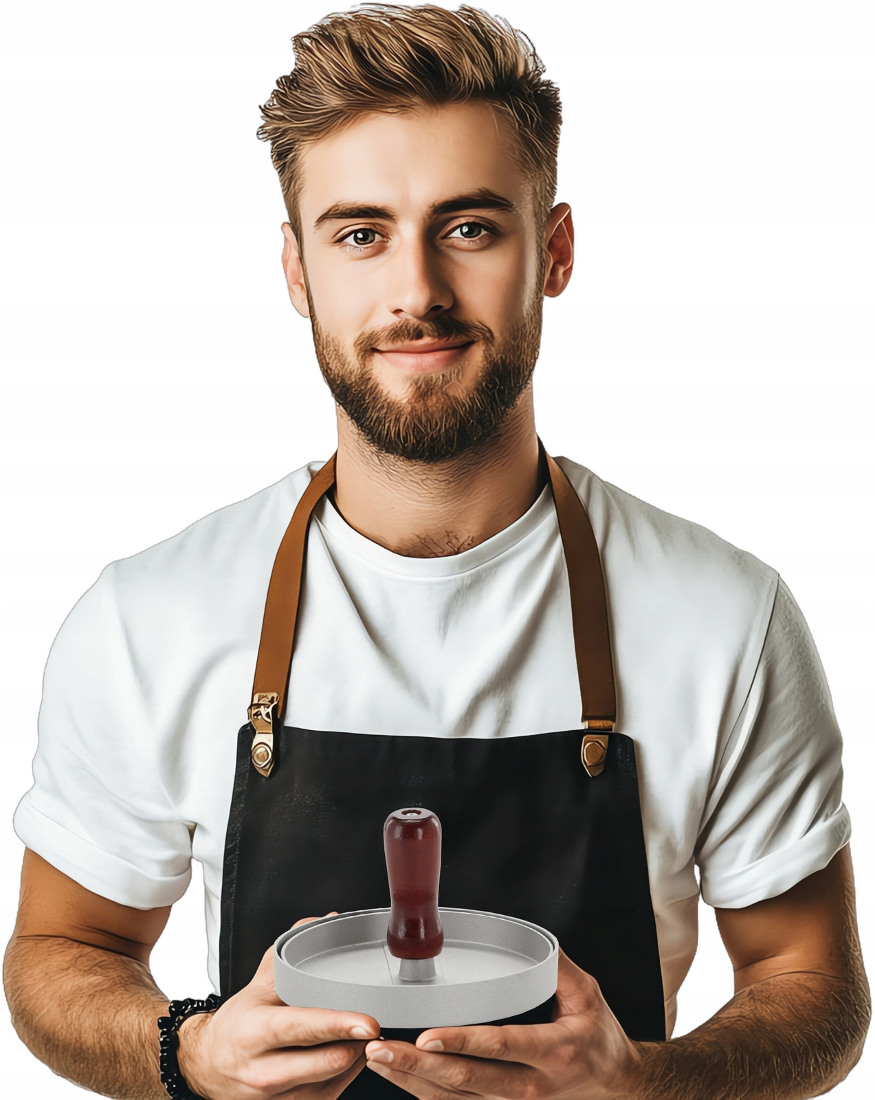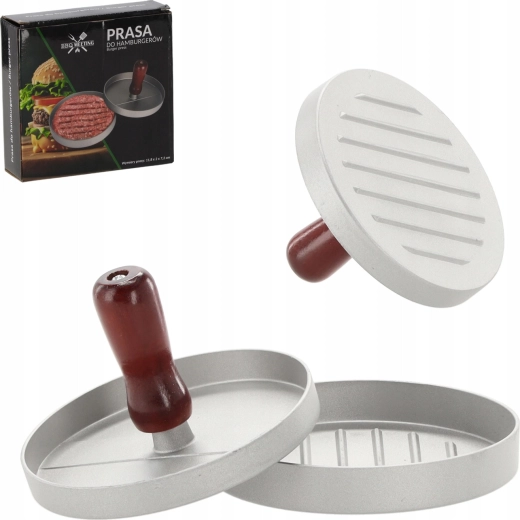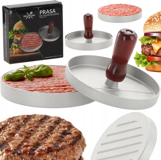 Denne praktiske burgerpres sikrer ensartet form og tykkelse på bøfferne, så de tilberedes bedre og ser professionelle ud på tallerkenen. Det holdbare aluminiums-korpus i stilren grå og det behagelige træhåndtag giver sikker kontrol og lang levetid.
