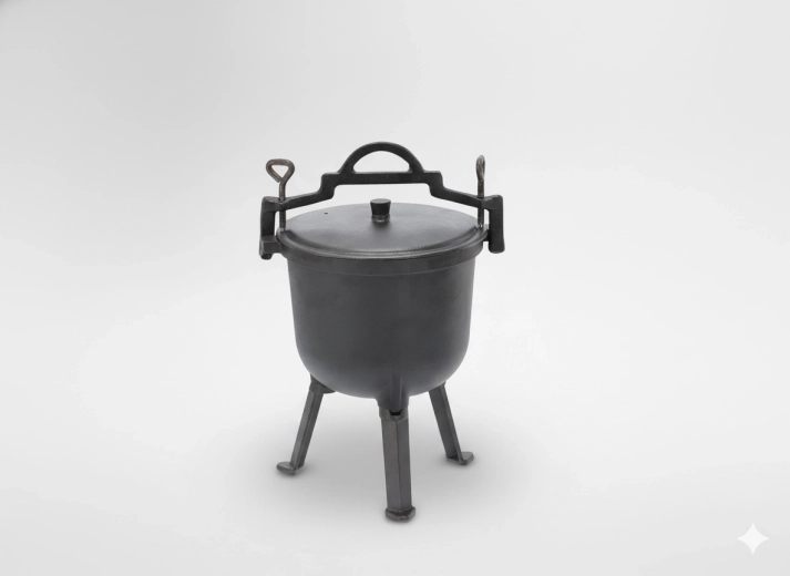 Tre robuste ben og et låg sikrer sikker og bekvem madlavning over flammen. Hanken gør det nemt at bære eller hænge gryden på en trefod.