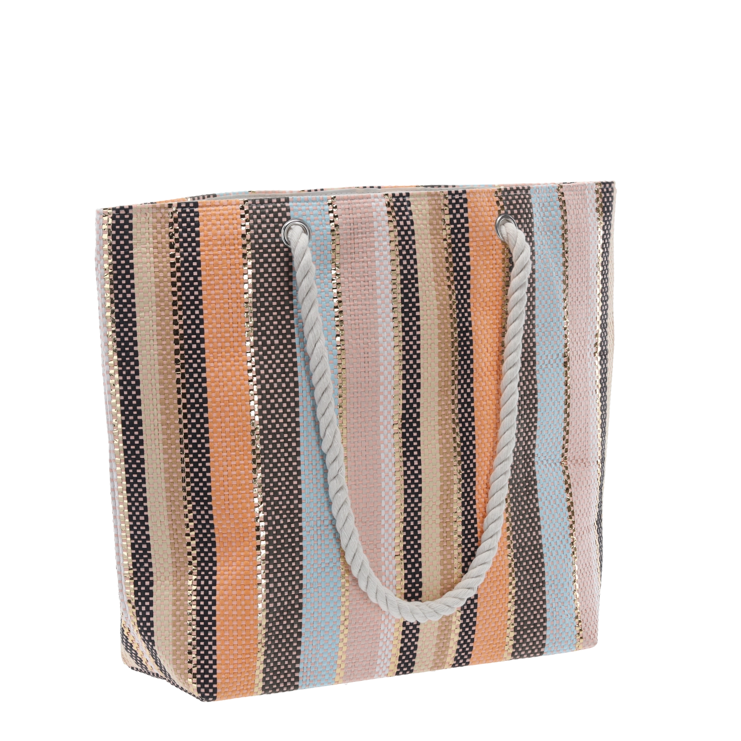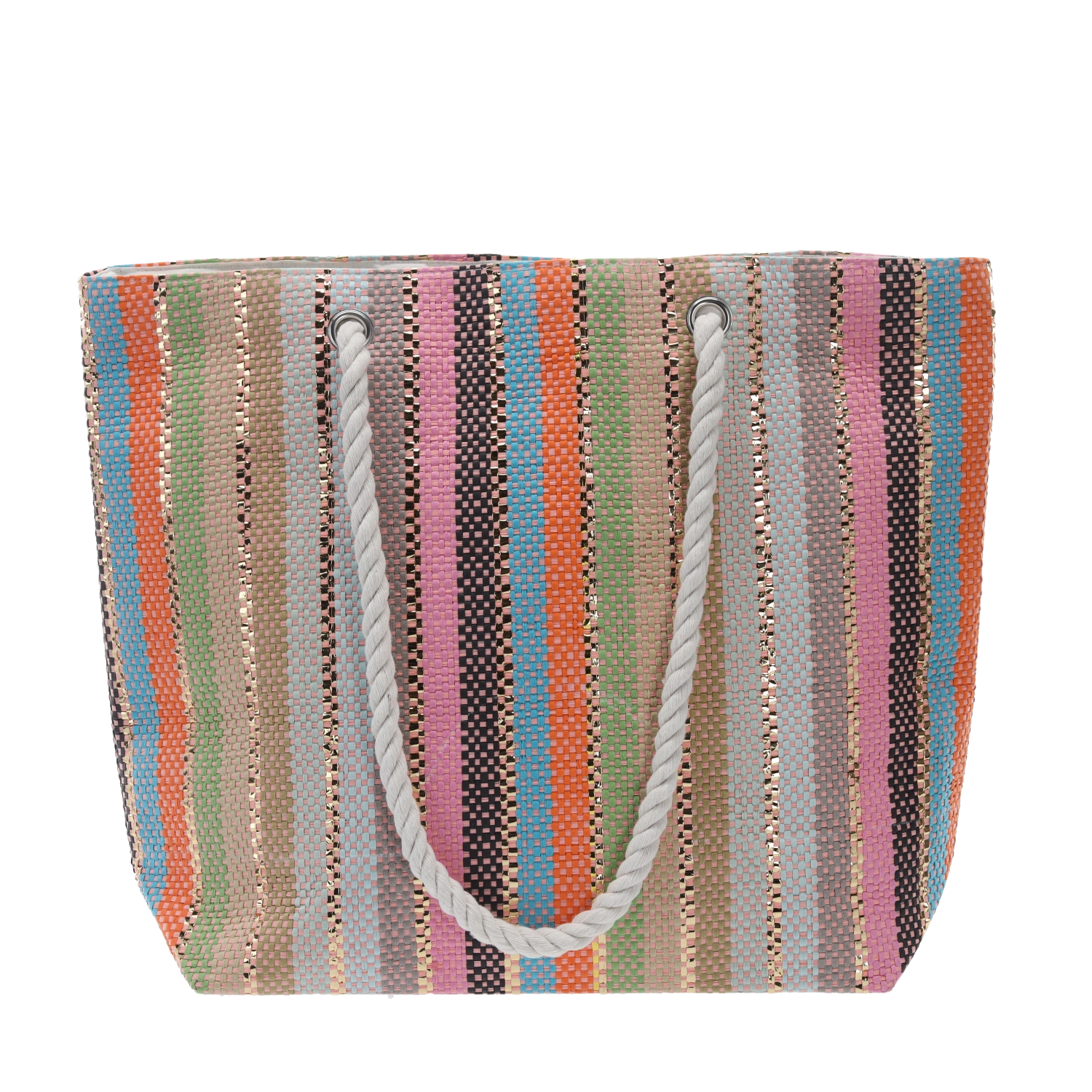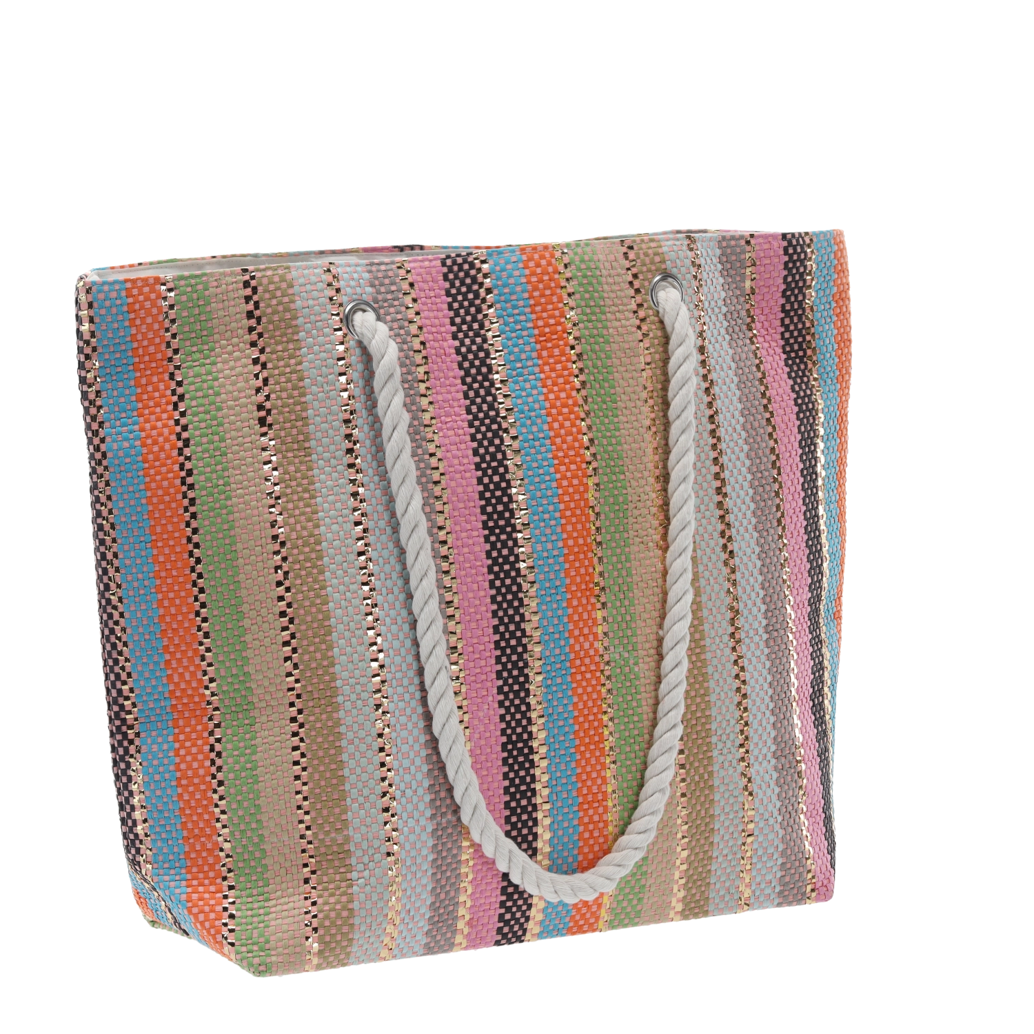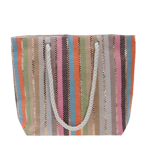 Stilfuld og praktisk strandtaske med flerfarvede striber og kraftige rebhåndtag, som giver rigelig plads til håndklæde, solcreme og vandflaske. Takket være den lette konstruktion og den rumelige åbne top er den ideel til stranden, shopping og sommerudflugter.