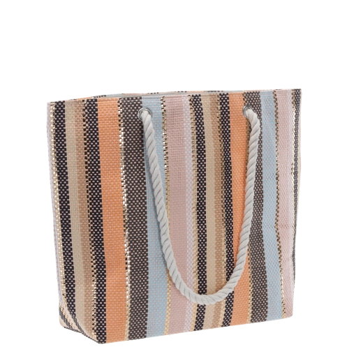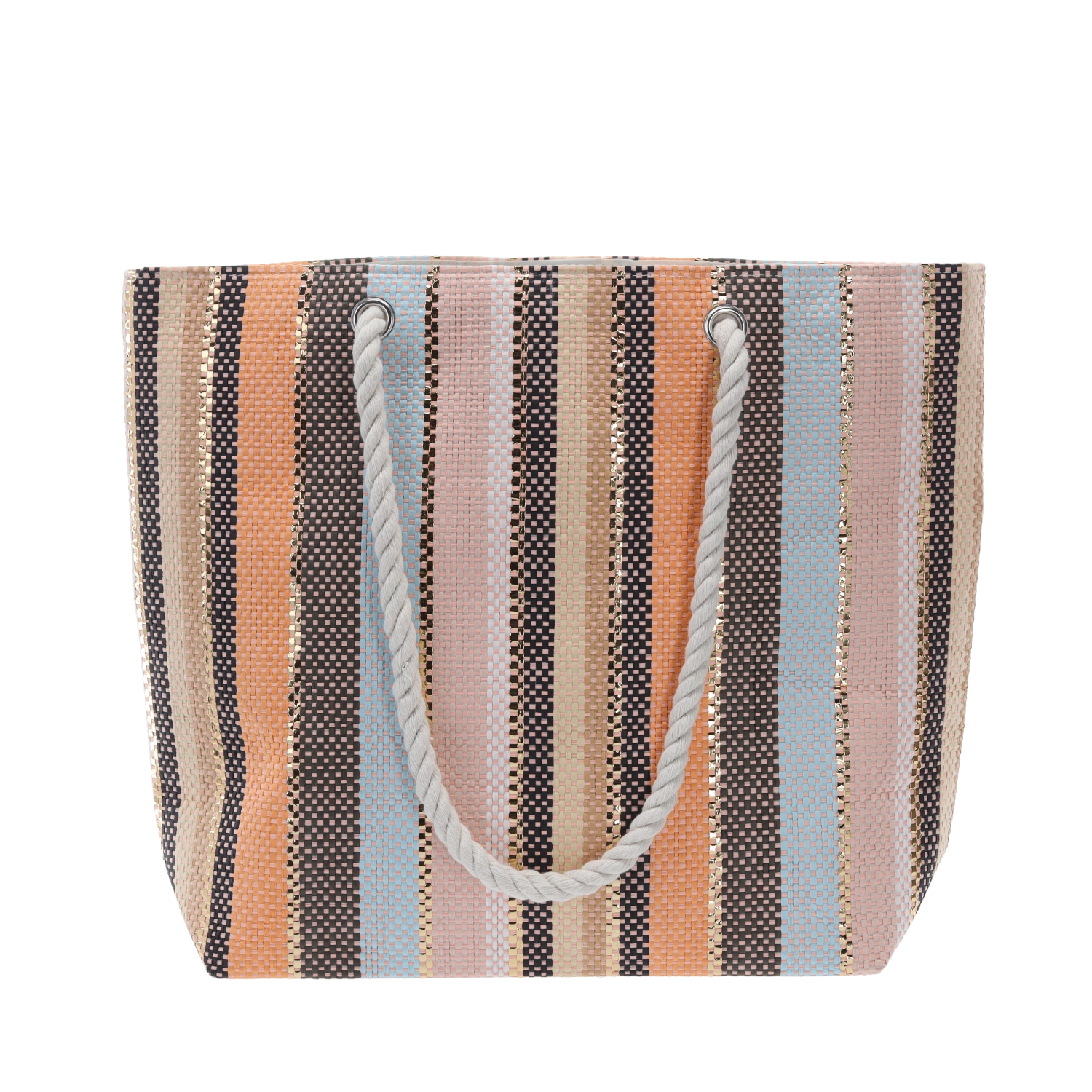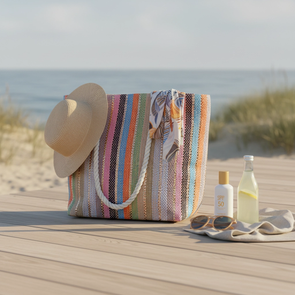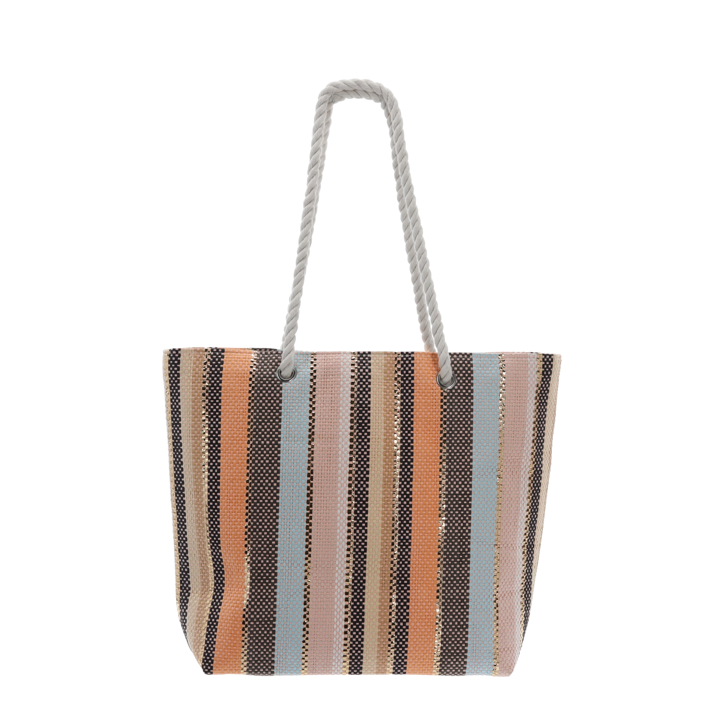 Stilfuld og praktisk strandtaske med flerfarvede striber og kraftige rebhåndtag, som giver rigelig plads til håndklæde, solcreme og vandflaske. Takket være den lette konstruktion og den rumelige åbne top er den ideel til stranden, shopping og sommerudflugter.