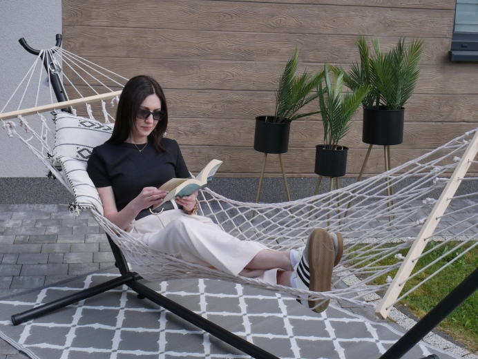 Takket være den robuste konstruktion med en bæreevne på 120 kg og de komfortable mål på 200 × 80 cm giver den sikkerhed og komfort til én person. Den neutrale beige farve matcher nemt enhver udendørs- eller indendørsstil og tilfører rummet en rolig, naturlig atmosfære.