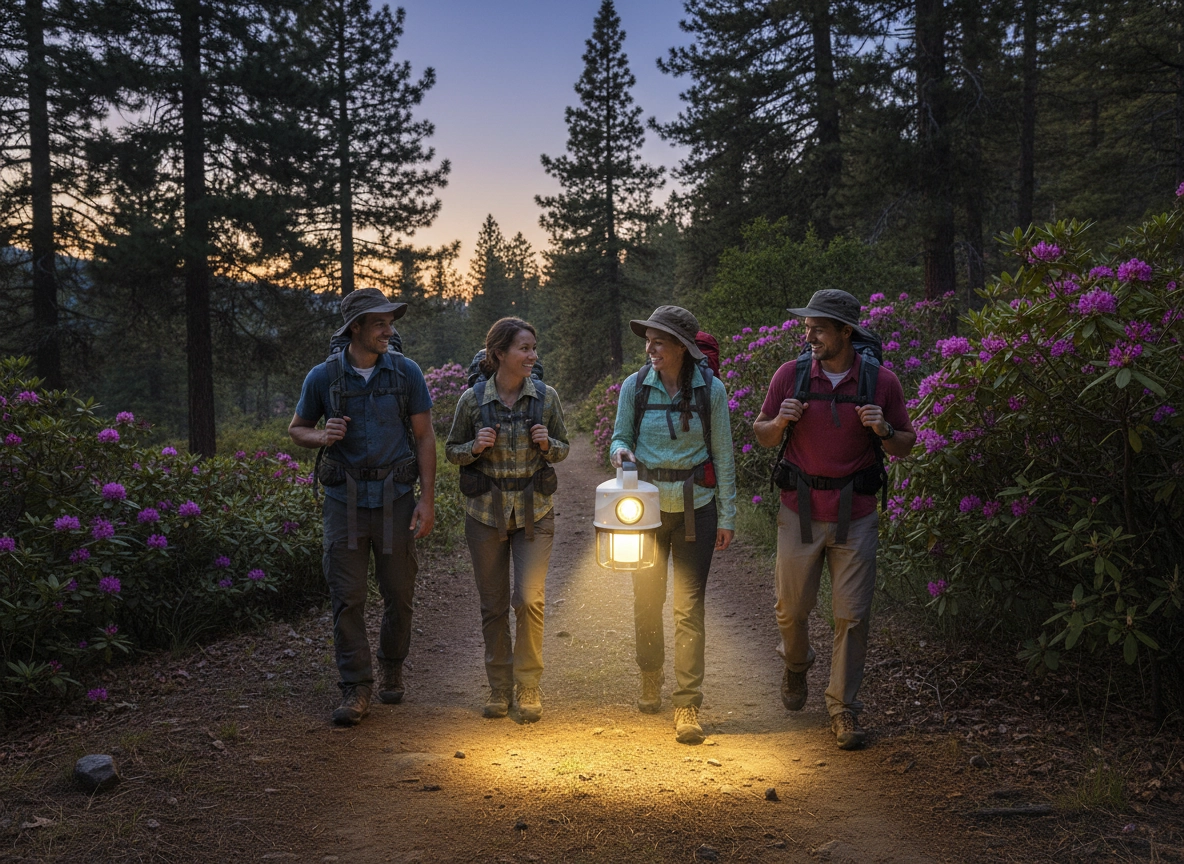 Oplys lejrpladsen, stien og værkstedet. Det diffuse bundlys giver behagelig fladebelysning, mens side-spotlygten leverer en skarp, retningsbestemt stråle til arbejde og orientering.