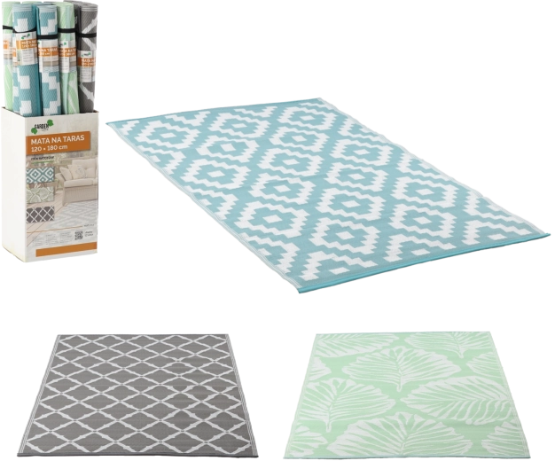 Størrelsen 120 × 180 cm er ideel under havemøbler, til at definere en afslapningszone eller som base til børns leg. Mixet af mønstre i grønne, grå og turkise nuancer kan nemt matches med forskellige indretningsstile.