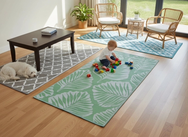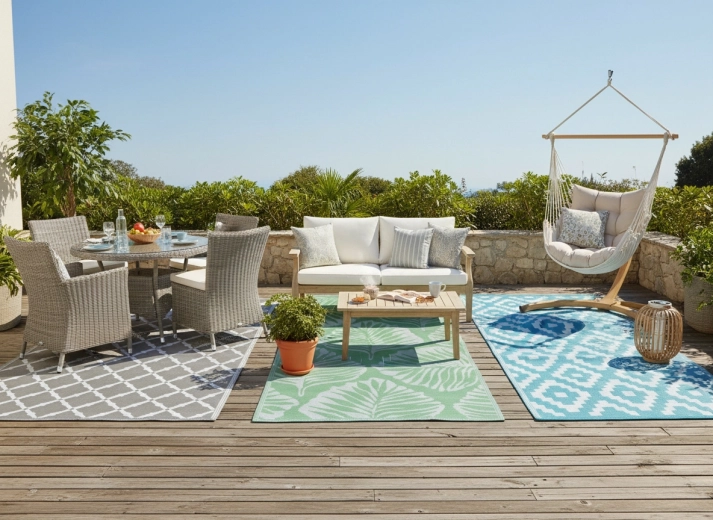 Det fladvævede tæppe i polypropylen er modstandsdygtigt over for fugt og vejr, tørrer hurtigt og er let at rengøre – et ideelt valg til brug udendørs hele sæsonen.